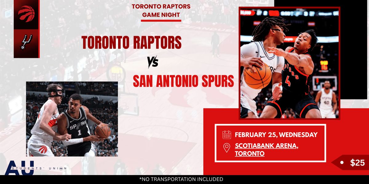 Join AUSU as we watch The Toronto Raptors face off against the Antionio Spurs in the Scotia Bank Arena In Toronto. The Doors open at 6PM and the games starts at 7:30 PM so make sure you show up early so you can get to your seat in time. Transportation to the Game and back home is not proivded by AUSU.The seats provided will be tier 5.