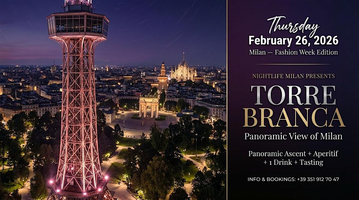 Thu 26/02/2026: Torre Branca Experience @ Just Me Milano. 15 € includes tower access + aperitif + Italian traditional food tasting + surprise wine/specialty tasting (till 22:00). DJ after in venue (timing via WhatsApp). Official ticket link provided.