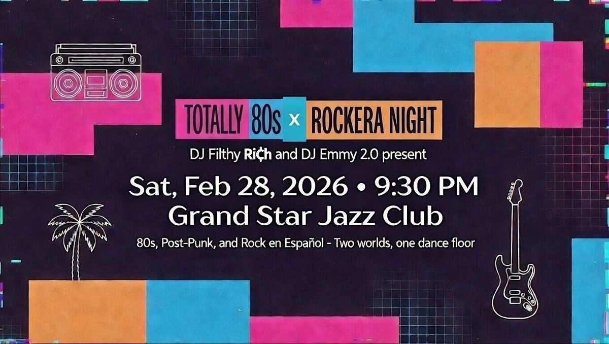 DJ Filthy Ri¢h and DJ Emmy 2.0 present Totally 80s x Rockera Night: 80s, Post-Punk, and Rock en Español! Two worlds, one dance floor. From Depeche Mode to Soda Stereo, The Cure to Caifanes, Tears for Fears to Héroes del Silencio. New Wave, Synth-Pop, Post-Punk, and the best of Rock en Español all night long.