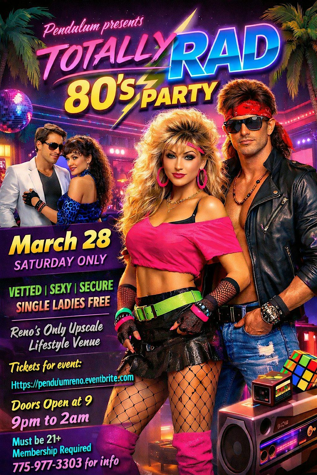 Step into a neon drenched night of big hair, bold fashion, and unapologetic energy. This is not just an 80s party. It is a full-throttle flashback where vintage vibes meet modern temptation.