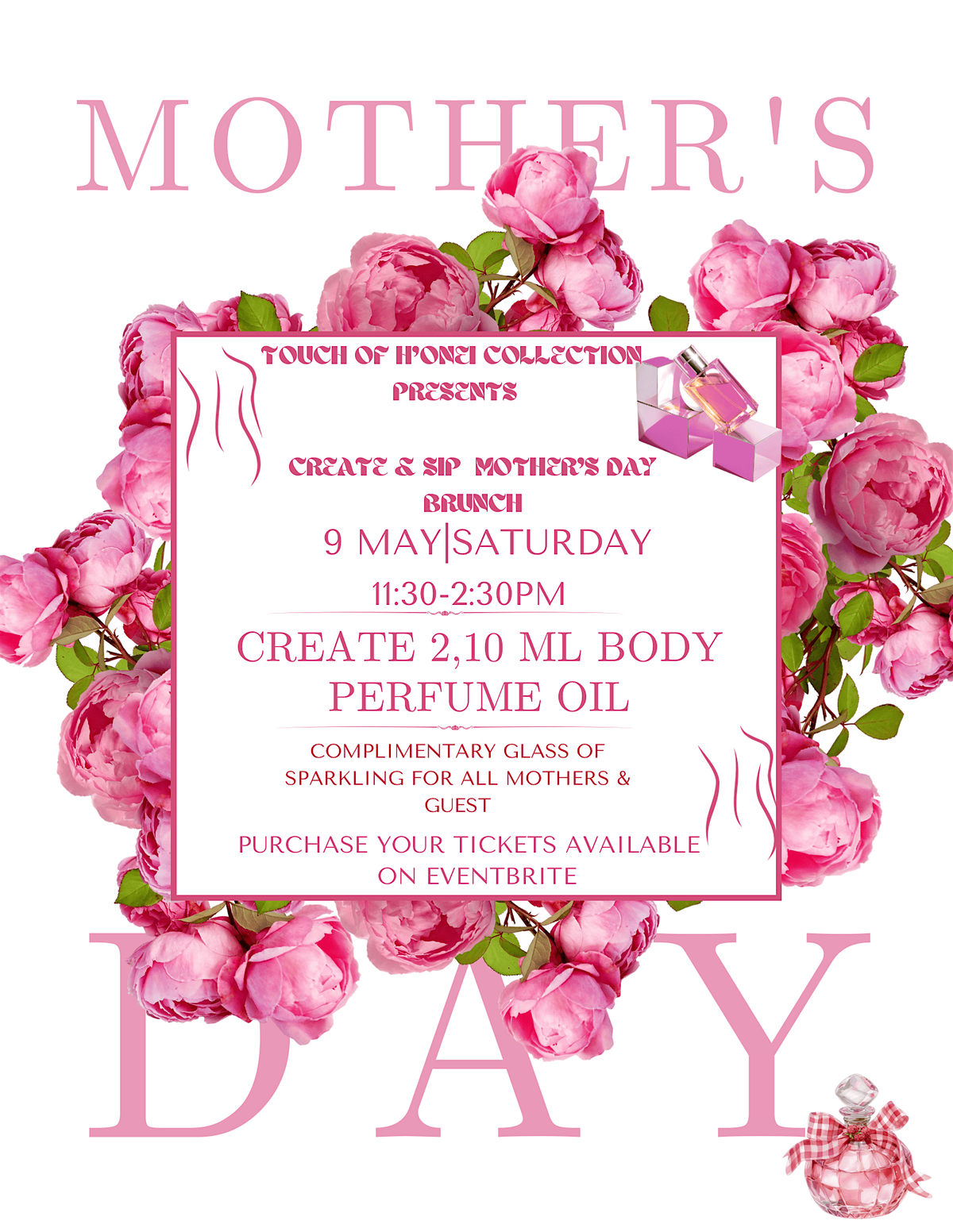 TOUCH OF H’ONEI COLLECTION PRESENTS CREATE & SIP Mother’s Day BRUNCH MAY 9 th for all MOTHERS AUNTS GRANDMOTHERS GODMOTHERS COUSINS SISTERS FRIENDS IT TAKE A VILLAGE LADIES, COME CREATE 2 10 ML BODY PERFUME OILS ALL NATURAL FOR YOURSELF OR A LOVELY WOMEN IN YOUR LIFE THAT YOU WANT TO GIVE THEM THEY FLOWERS 🌺 FOR A GIFT FOR MOTHERS DAY. VENUE WILL BE ANNOUNCED TIME 11:30-2:30pm come HAVE FUN CREATE BRUNCH SIP MIMOSAS FOR A CELEBRATION WITH ME THE OWNER OF TOUCH OF H’ONEI COLLECTION ( DIANE) YOU WILL BE ABLE TO GET YOUR TICKETS THAT WILL BE AVAILABLE SOON, STAY TUNED 🦋💕💐💃🏿🎶💋🥰