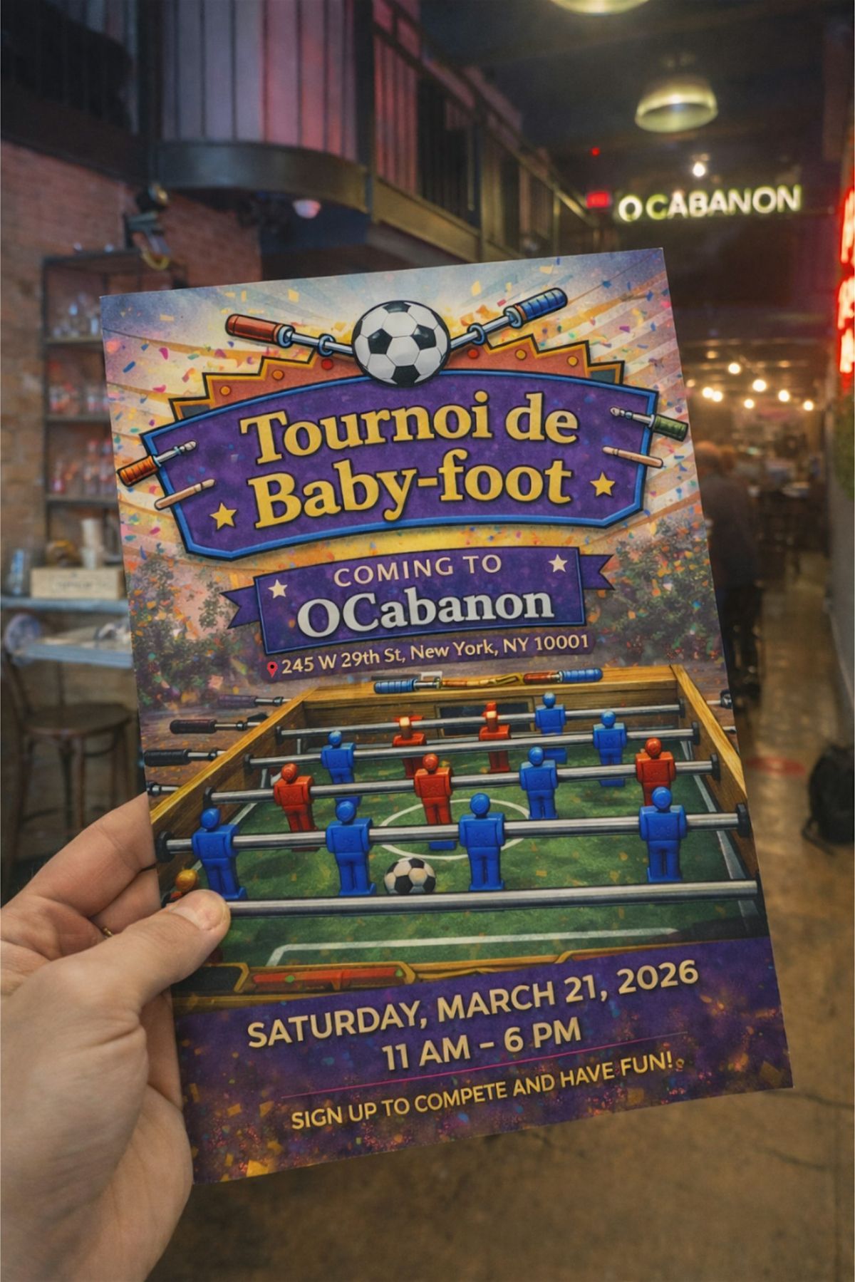 Welcome to the Tournoi de Baby-foot OCabanon 2nd Edition at OCabanon! Get ready for a day filled with intense foosball matches and friendly competition on March 21, 2026 at 12:00 PM (Eastern Time). Whether you're a seasoned pro or just looking to have some fun, this event is perfect for all skill levels. Join us for a chance to showcase your skills and connect with fellow foosball enthusiasts. Don't miss out on this exciting event!
