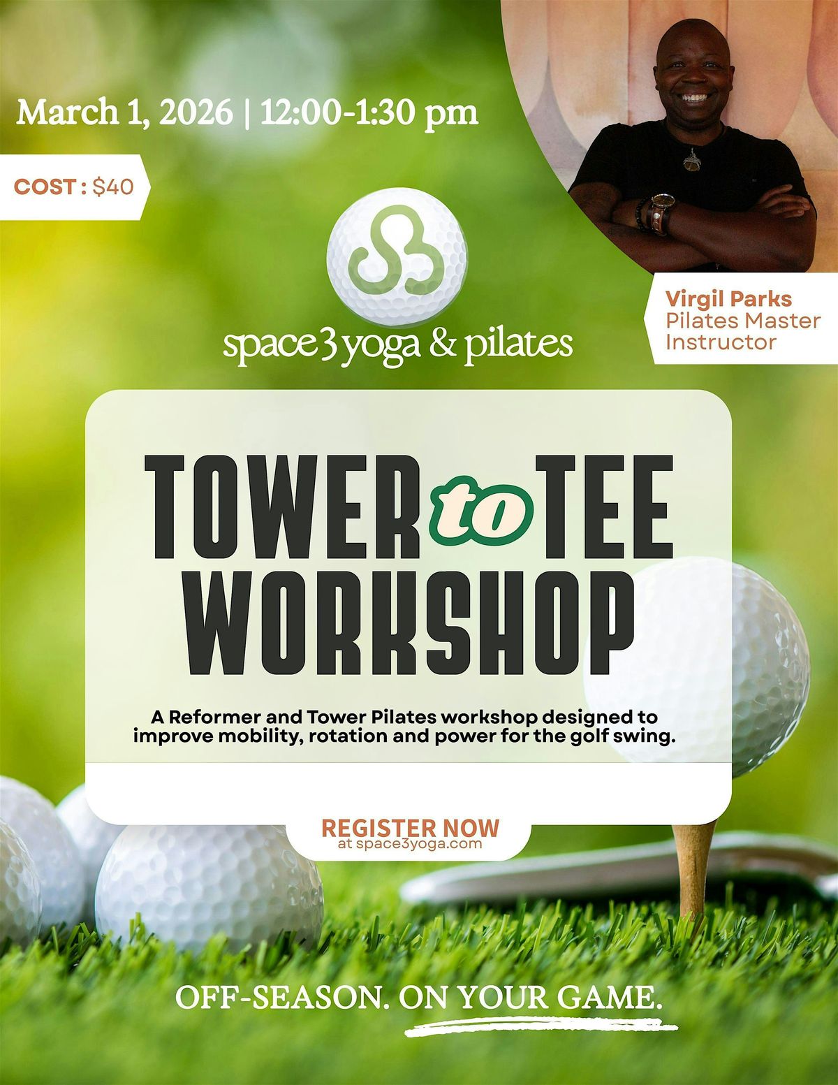 Join Master Pilates Instructor Virgil Parks for a 90-minute spring-based Pilates workout focused on the specific strength, mobility, and stability demands of the golf swing. Whether you're a weekend player or a seasoned golfer, this workshop will help you move more efficiently and swing with greater control.