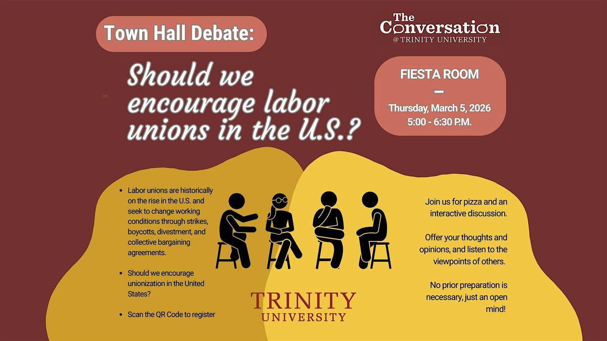 Join us on Thursday, March 5, 5:00 - 6:30 p.m. in the Fiesta Room at Trinity University, for pizza and an interactive discussion where we ask, "Should we encourage labor unions in the U.S.?"