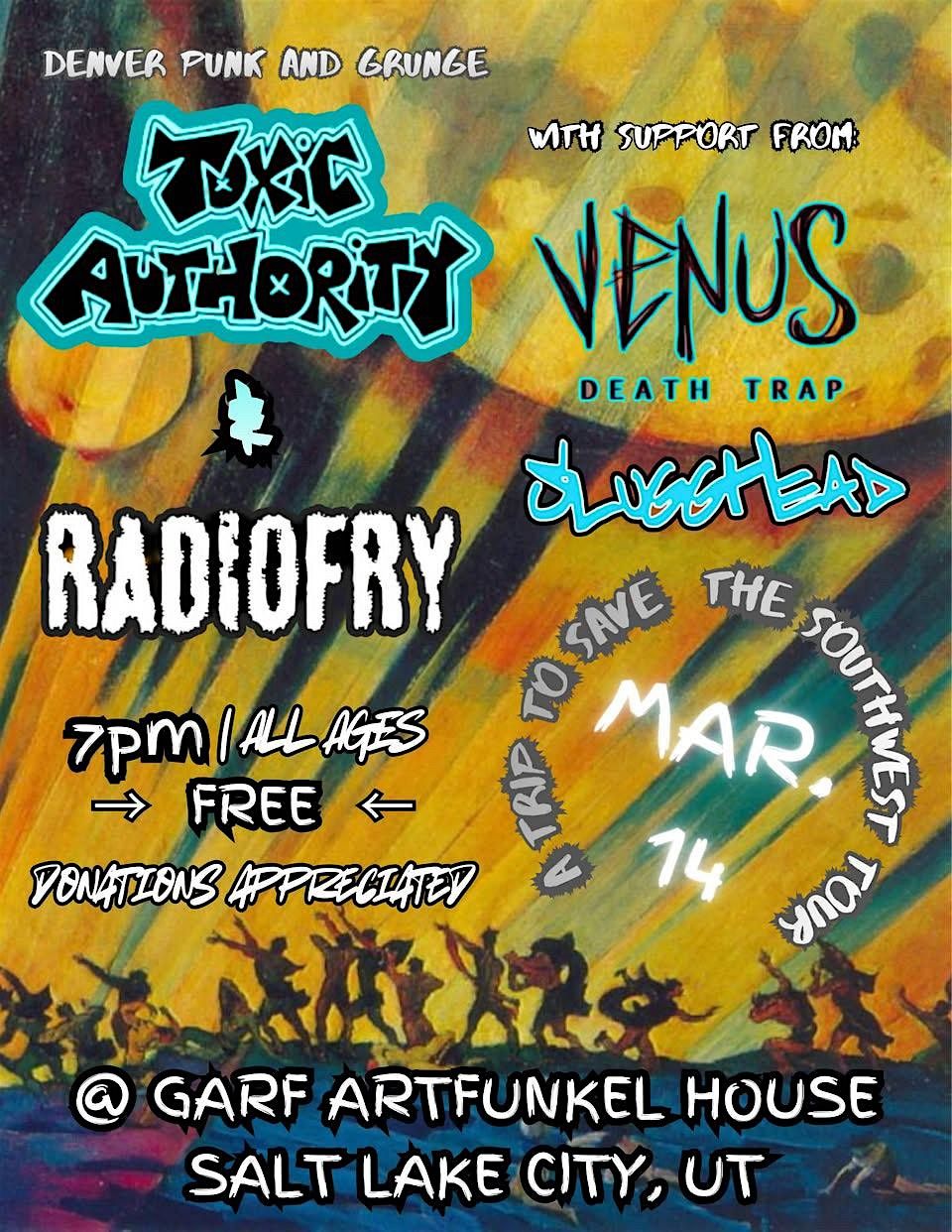Free house show featuring Denver punk/grunge artists - Toxic Authority, Radiofry. With support from local SLC artists - Venus Death Trap, Slugghead.