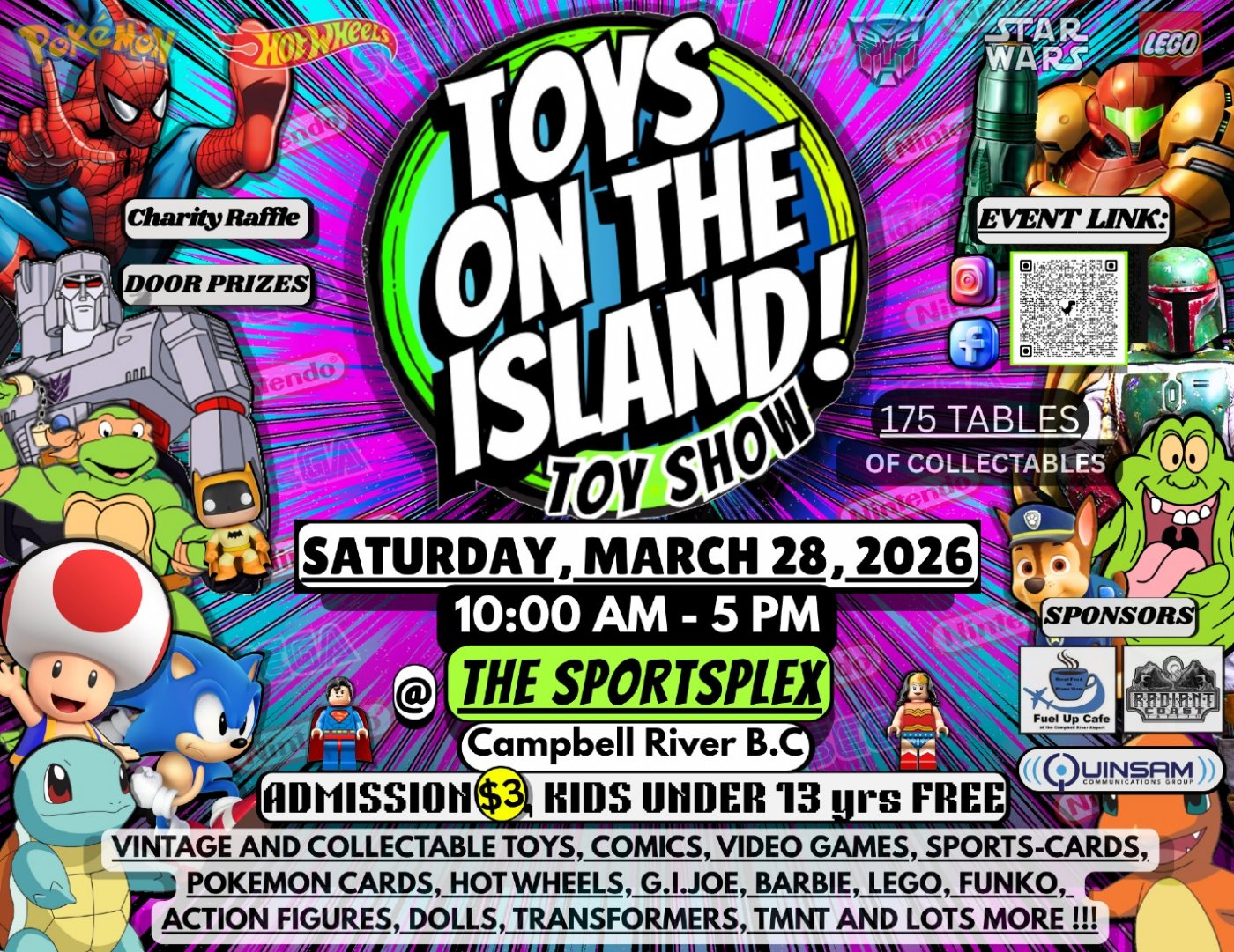 #toysontheisland #campbellriver #campbellriverbc #vancouverisland #comics #toys #pokèmoncards #videogames #vendors #gijoe #transformers #VINTAGETOYS #ACTIONFIGURES #LEGO #MAGICCARDS #BOARDGAMES #DND #SPORTSCARDS #FUNKOPOPS #HOTWHEELS #DOLLS #BARBIE #ARTISTS #vendors #fun #March28t #campbellriverSPORTSPLEX #foodtrucks #radientcoasttattoo #CampbellRiverHospitalAuxiliary #fuelupcafe #quinsamcommunicationsgroup #campbellriver #campbellriverbc