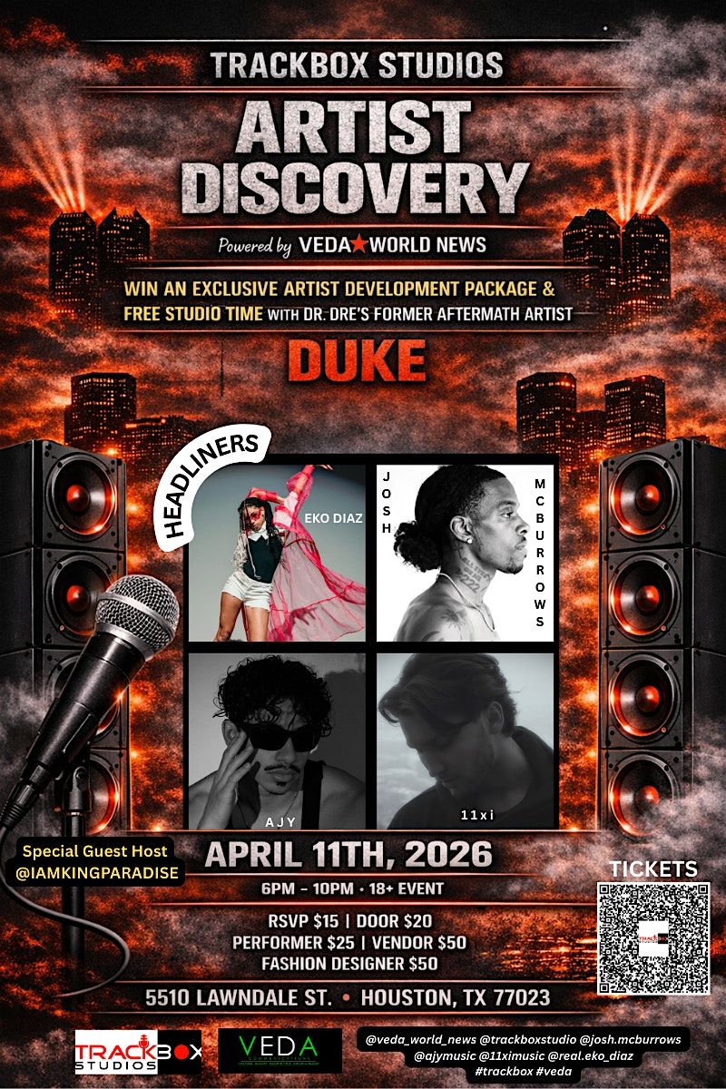 Win an exclusive Artist Development Package and Studio time with Dr. Dre's former Aftermath Artist - Duke. We'll be selecting several winners from various genres (R&B, Hip-Hop, Pop, Alt. Rock & Country) Join us in person for an epic Artist Discovery Night! It's your chance to get noticed, promote your music, connect with fellow creatives, and dive into the music scene. Whether you're a singer, rapper or simply a spectator, this is the spot to make your mark. Don’t miss out on this showcase event to grow your network!