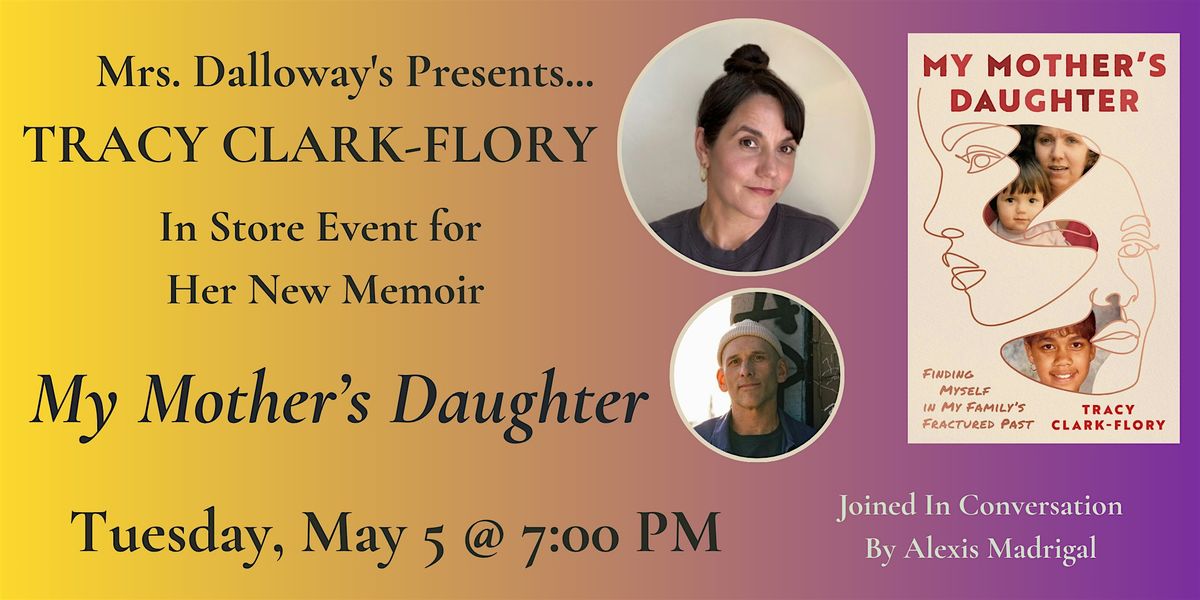 Join us at Mrs. Dalloway's Bookstore on Tuesday, May 5 when author Tracy Clark-Flory comes to the store to present her new book My Mother's Daughter: Finding Myself in My Family's Fractured Past. Tracy will be joined by Alexis Madrigal for the conversation and will sign copies of her book after the presentation.