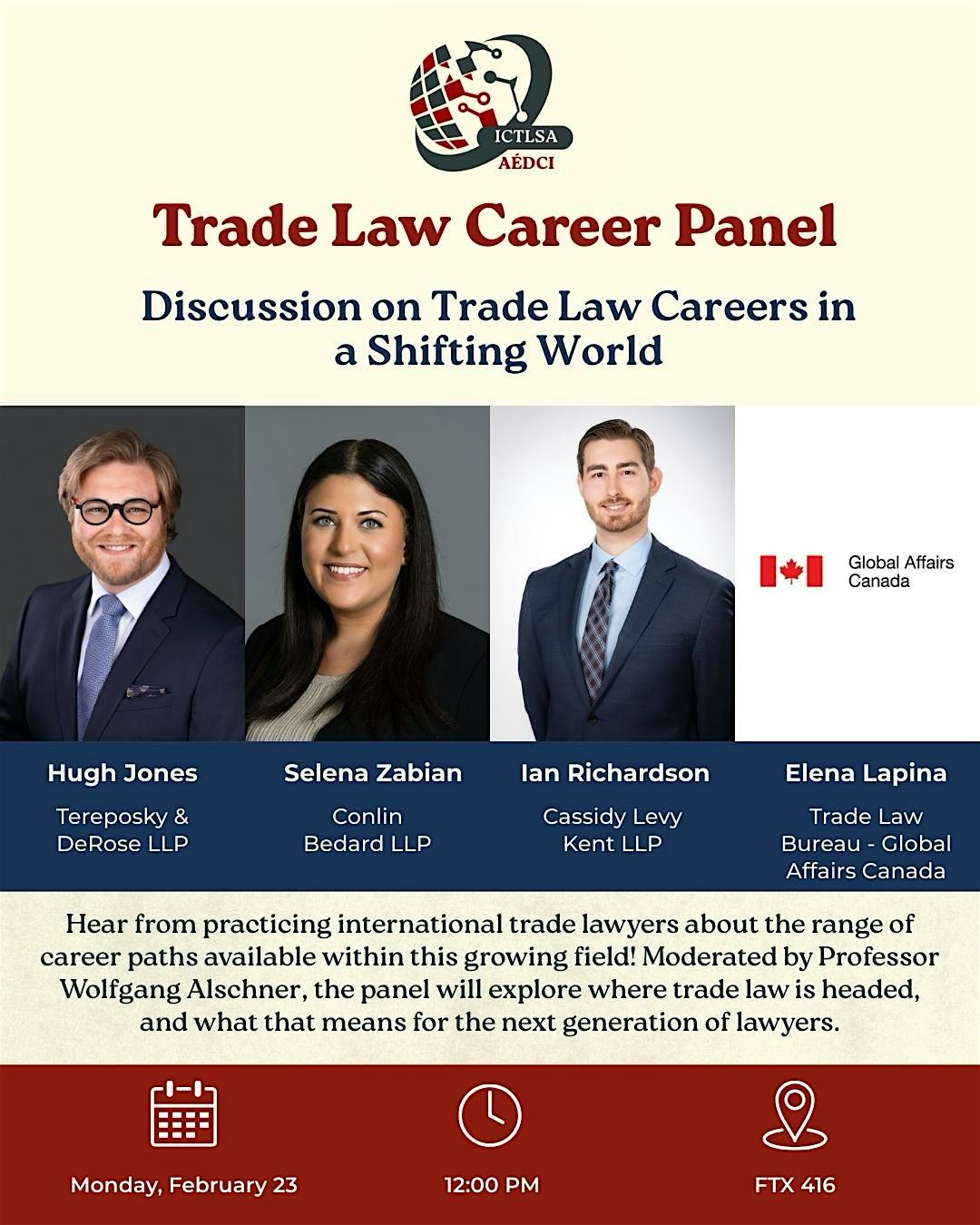 Hear from practicing international trade lawyers about the range of career paths available within this growing field! Moderated by Professor Wolfgang Alschner, the panel will explore where trade law is headed and what that means for the next generation of lawyers.