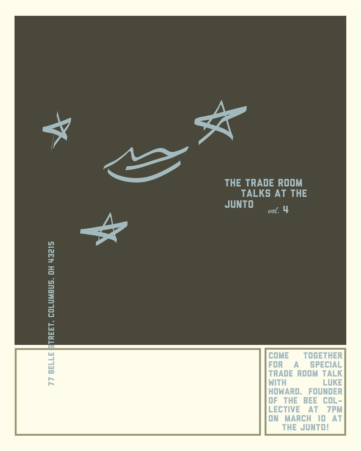 JOIN US on Tuesday, March 10 from 7p-9p by mingling with familiar and new faces in the Trade Room at The Junto- a gorgeous new hotel just west of downtown in Franklinton, across from Cosi. Centered around the idea of coming together, The Junto welcomes all for this special series. There will be snacks and drinks available, lots of cozy seating and even a little outdoor space to hang out in.
