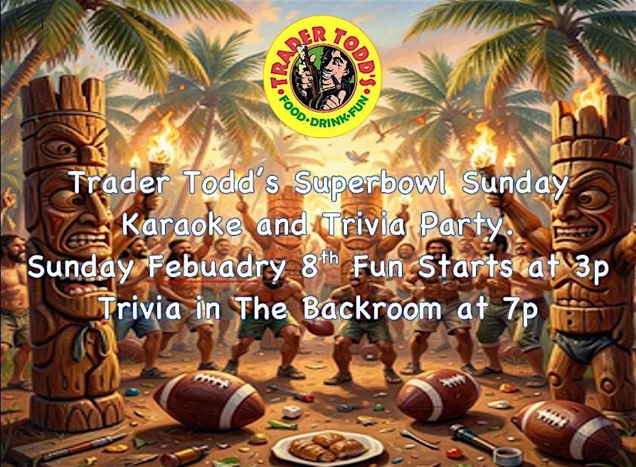 Trader Todd’s Tiki Super Bowl Party. Palm fronds defy winter, screens roar, cocktails sweat, and Chicago briefly believes it’s island time.About this Event