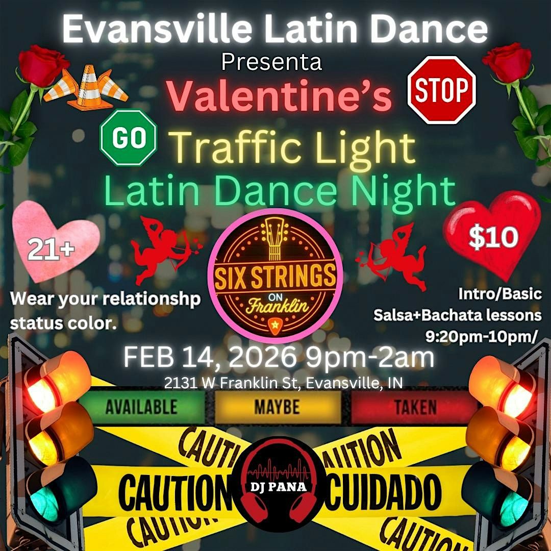 Latin Dance and Traffic Light Party! Salsa, Bachata, Cumbias, Merengue! Come early for our basic intro latin dance lessons and stay for the Valentines dance! Party goers wear green, yellow, or red to advertise their relationship status. Everyone is welcome, and party patrons get to meet like minded people.
