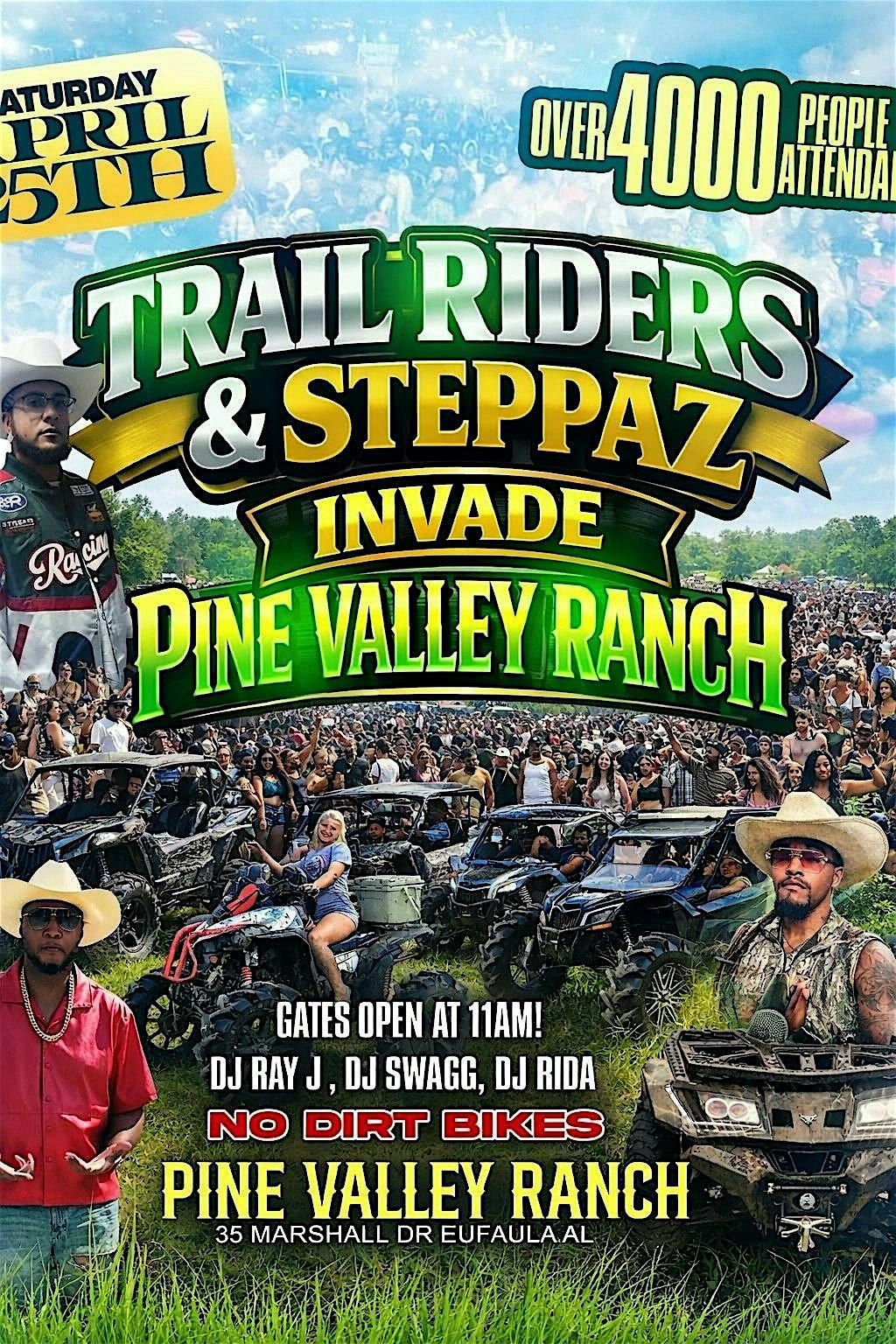 Trail Riders & Steppaz are invading Pine Valley Ranch on Saturday, April 25th and it’s about to be EPIC! 🎉🔥 We’re running it back even bigger this year! Gates open at 11AM!