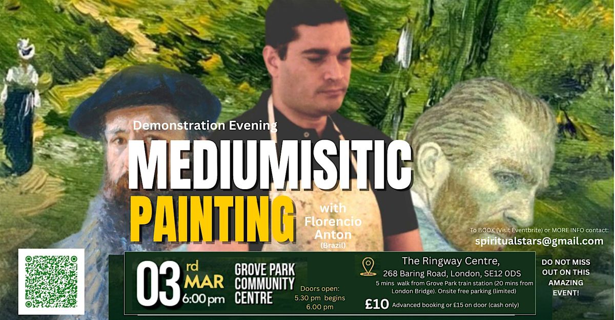 Join us in person for a rare and deeply moving LIVE Mediumistic painting demonstration by Florencio Anton, an internationally renowned mediumistic painter from Brazil.