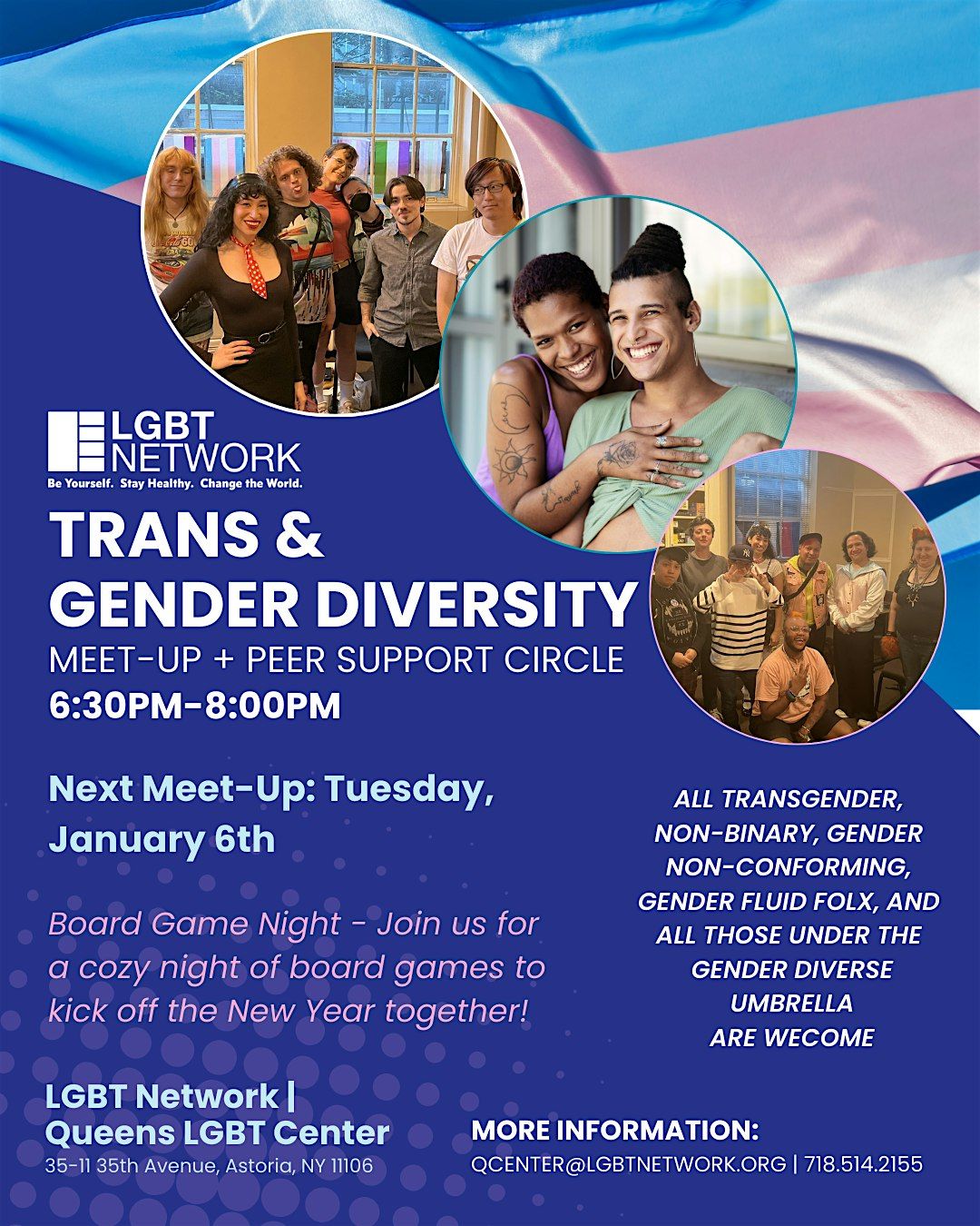 Join our new social mixer for trans and non-binary folks! This monthly meet-up is an opportunity to make friends and meet new people within the transgender, gender non-conforming, and non-binary community in a relaxed environment. Each month, we will have different games and activities to help you have fun and socialize while creating community. This month, join us for a fun and friendly Board Game Night!