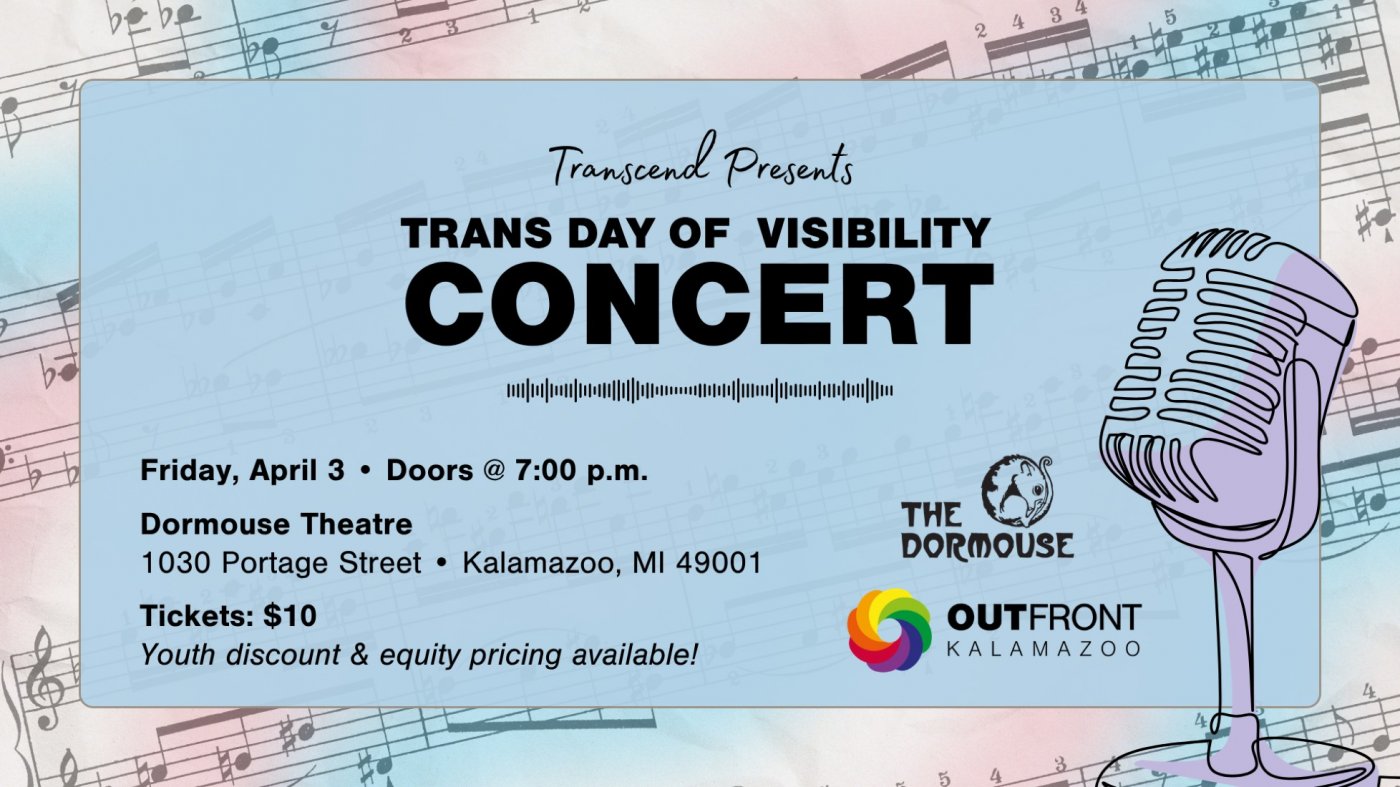 OutFront Kalamazoo's Transcend is proud to present our annual Trans Day of Visibility Concert! Join us on Friday, April 3 at the Dormouse Theatre for a lineup of incredibly talent local trans+ musicians. Doors open at 7:00 p.m. Get your tickets now at https://outfrontkzoo.ludus.com/index.php?show_id=200524818.