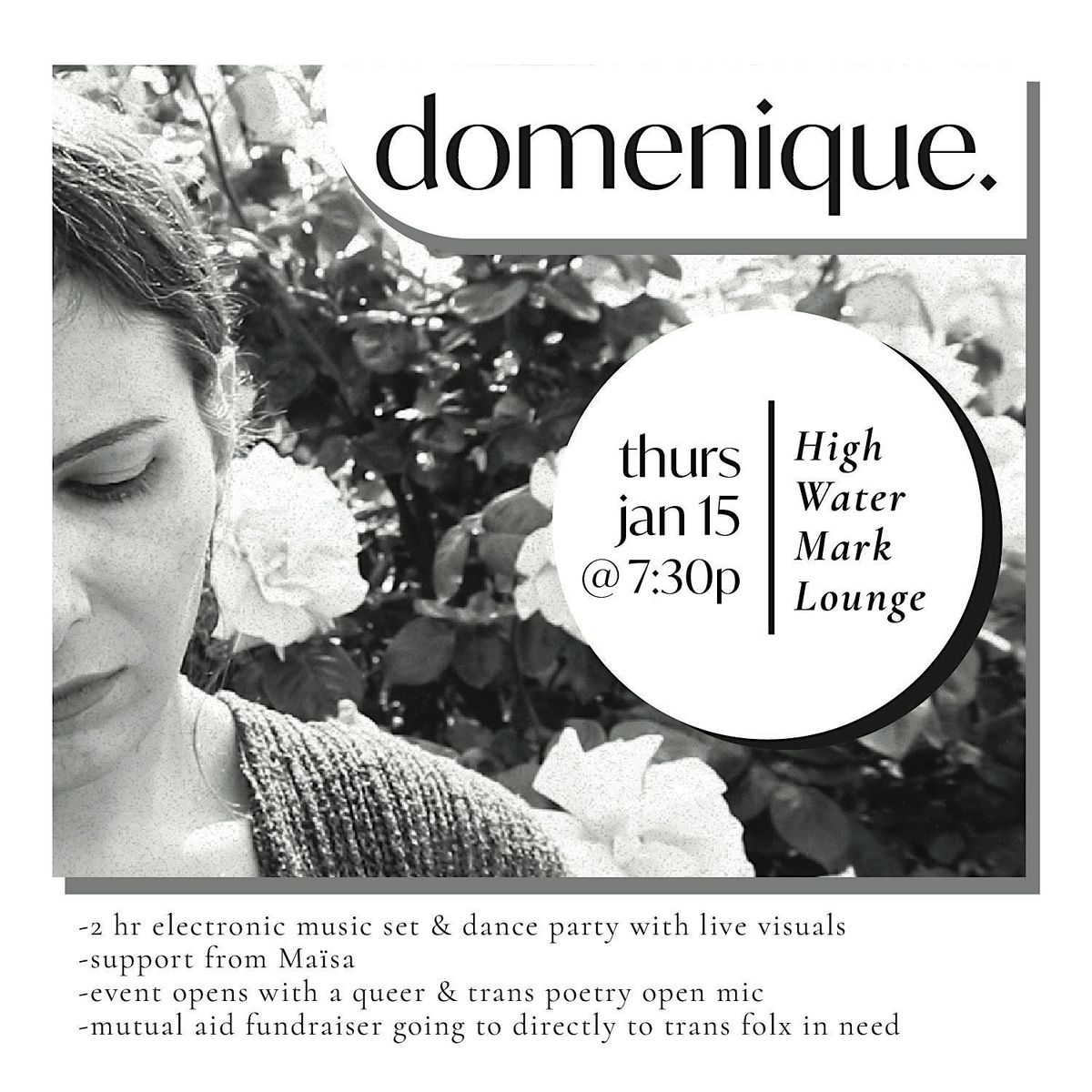 Join Domenique (she/her) for a cozy, cathartic, and very danceable night celebrating her 34th birthday and the release of her debut electronic album and poetry book—both written over the past year and rooted in lived experience, resilience, and self-discovery. There will be cake