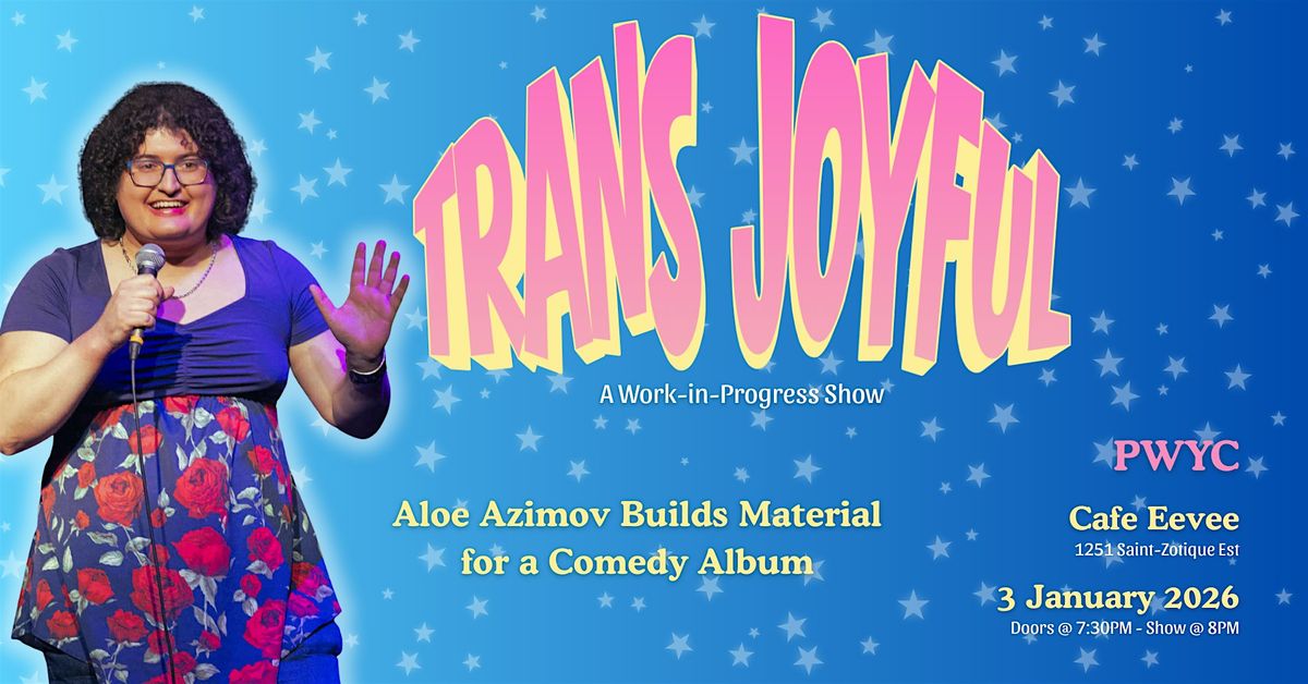 Trans Joyful A Work in Progress show is exactly what it sounds like. Comedian Aloe Azimov builds material for their comedy album and performs a 30 minute set in this show alongside incredibly talented comedians!!! This all takes place Saturday January 3rd at Cafe Eevee at 8pm!!!