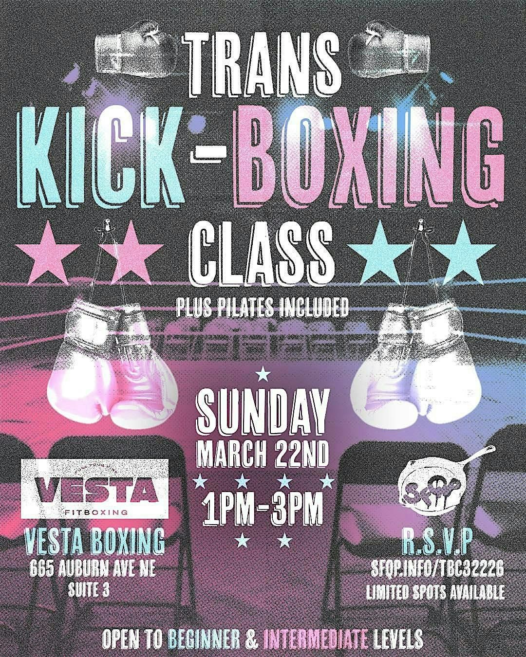 Join VESTA Fitboxing & Southern Fried Queer Pride for Trans Kick-Boxing at 1PM on Sunday, March 22nd at VESTA Fitboxing (665 Auburn Ave NE Suite 3, Atlanta, GA 30312). This an intentional & inclusive space for trans & non-binary folks of all experience levels to learn and engage with kick-boxing amognst community! PLUS a pilates course included!