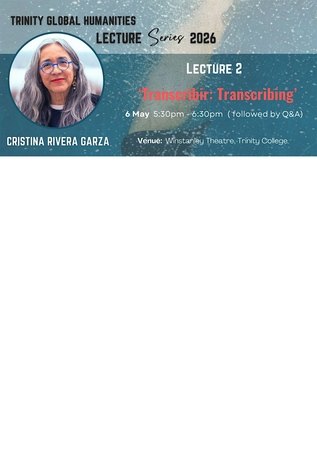 Join us for the Trinity Global Humanities Lecture Series 2026: Tactile: Archives, Collective Memory and Bodies, featuring Pulitzer Prize–winning author, translator, critic, and MacArthur Fellow Cristina Rivera Garza.