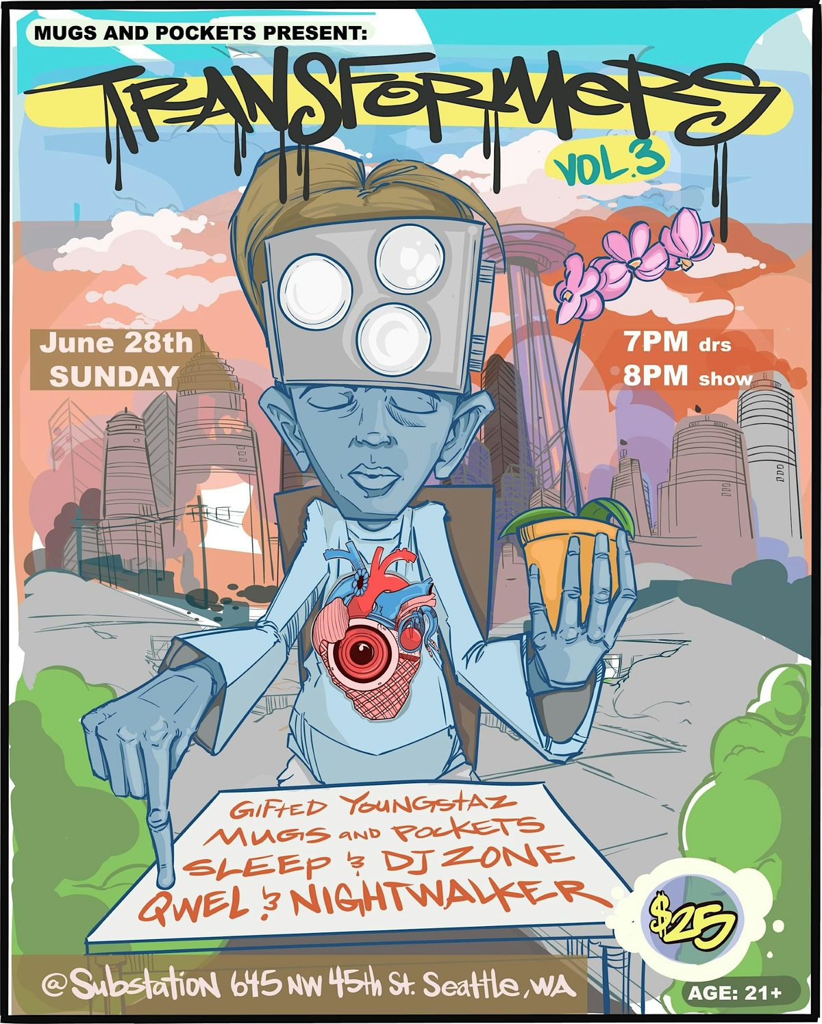 Transformers Vol. 3 - Transformers Vol. 3 is part of a live show series with high caliber talent! A curated Hip Hop experience that showcases range of show, lyrical dynamic, and exceptionally feel good vibes. Vol. 3 kicks it off with a double headliner, featuring Sleep (of Oldominion), and Qwel (of Typical Cats).