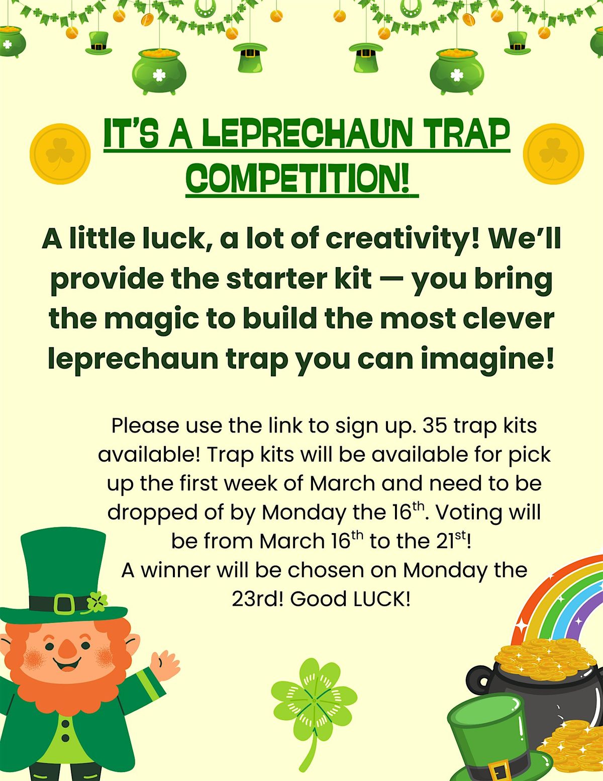 Use your imagination, problem-solving skills, and a little bit of Irish-inspired mischief to create a trap clever enough to catch a sneaky leprechaun! Once all traps are turned in, they’ll be displayed for community voting — and the creator of the most impressive trap will take home the gold. 🥇🍀