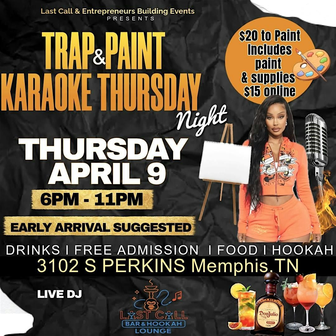 MEMPHIS, TN …. EAST MEMPHIS Area‼️ Thursday April 9th Trap & Paint Karaoke Night 🎤🎨🎶 Last Call Bar & Hookah lounge …Thursday Nights Hit Different…only $20 to paint & $15 if you purchase them online! The Best EGG Rolls, Wings, & Drinks in the City ,Great Food, & Good Music , Live DJ 🎤 A Vibe That you Don’t Want to Miss A Vibe That you Don’t Want to Miss!!!! EARLY ARRIVAL SUGGESTED‼️ Tag Your Friends & Folks who Coming With You Because This is Going to be a Vibe!!! Come Eat, Drink, & Grab you a Canvas to Paint! FREE ADMISSION 🎨🍸😎🎶🎤🥃🍹