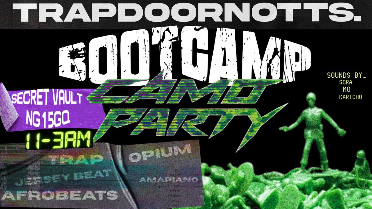 THIS EVENT WILL SELL OUT QUICK ⚠️ ENLIST NOW. WE ARE BACK WITH A NEW VENUE. NEW VIBES AND A CAMO DRESS THEME.UR FAV GENRES - TRAP UK UNDERGROUND JERSEY BEAT RNB AFROBEATS AND AMAPIANOPLEASE WEAR A CAMO PIECE OF CLOTHING TO THIS EVENT. ANY COLOUR ! (INSPO ON IG @trapdoornotts) 300+ OF YOU WILL BE PARTYING.Disclaimer: