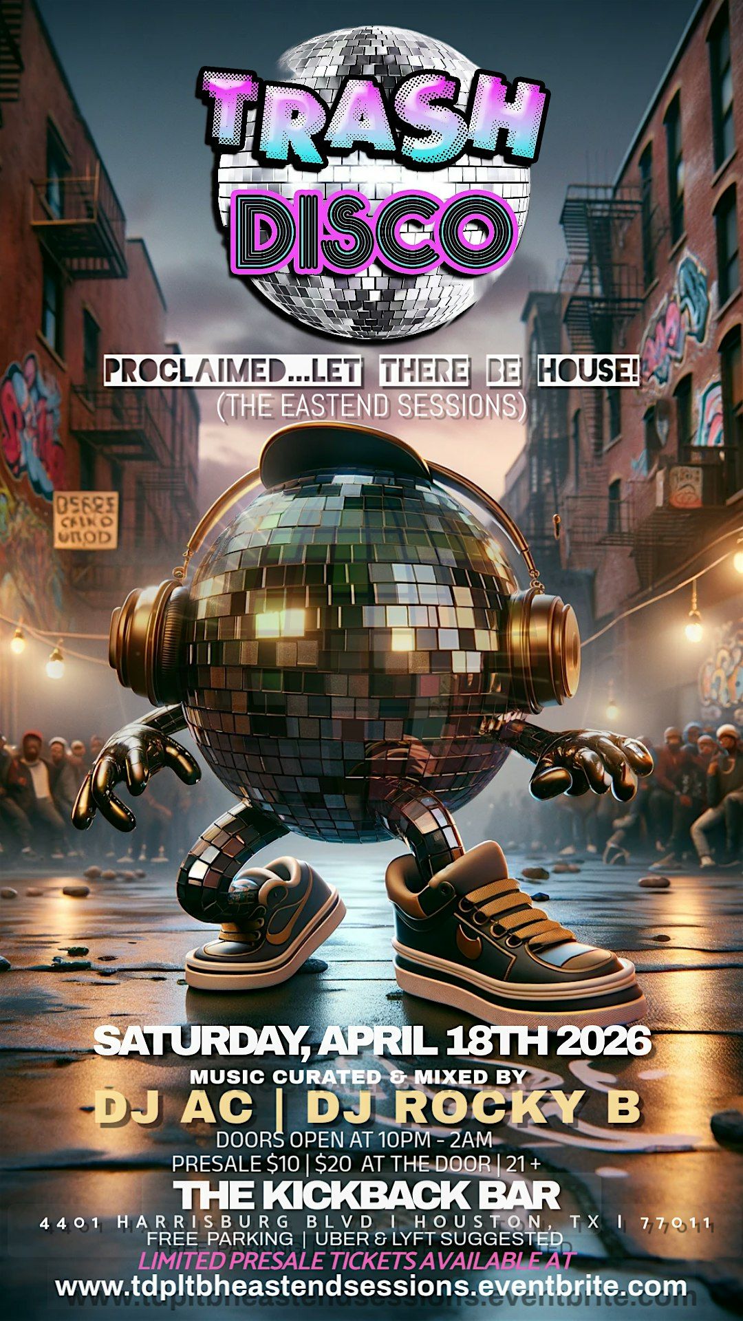 Get ready for an epic night at TRASH DISCO PROCLAIMED! LET THERE BE HOUSE! Bringing the vibes straight to the East End with beats that’ll keep you moving all night long. This is an in-person event packed with energy, music curated by 2 of Houston's Legendary DJs, and YOU!! Don’t miss out on the ultimate Disco + House music experience right in the heart of the city. Come through for an incredible party where "Dancing Is Required"!