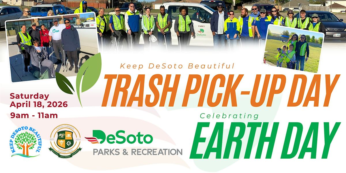 Let's come together to celebrate Earth Day by giving back to our community and keeping DeSoto beautiful! Join us for Trash Pick-Up Day as we clean up our neighborhoods, parks, and public spaces. Your efforts will make a big difference in keeping our environment healthy and green!