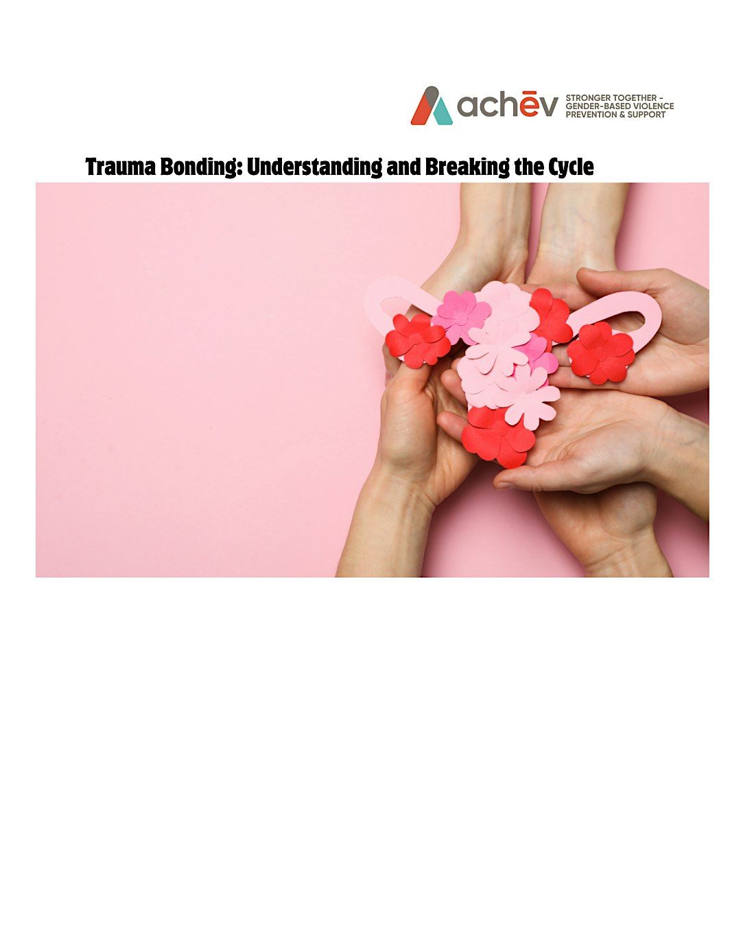 This workshop for women, offered in partnership with Achēv’s Stronger Together program, focuses on trauma bonding, how it develops, and how it can impact both personal and workplace relationships. Participants will learn to recognize key signs of trauma bonding and explore practical strategies to disrupt unhealthy attachment patterns, strengthen autonomy, and support recovery and safer connections.