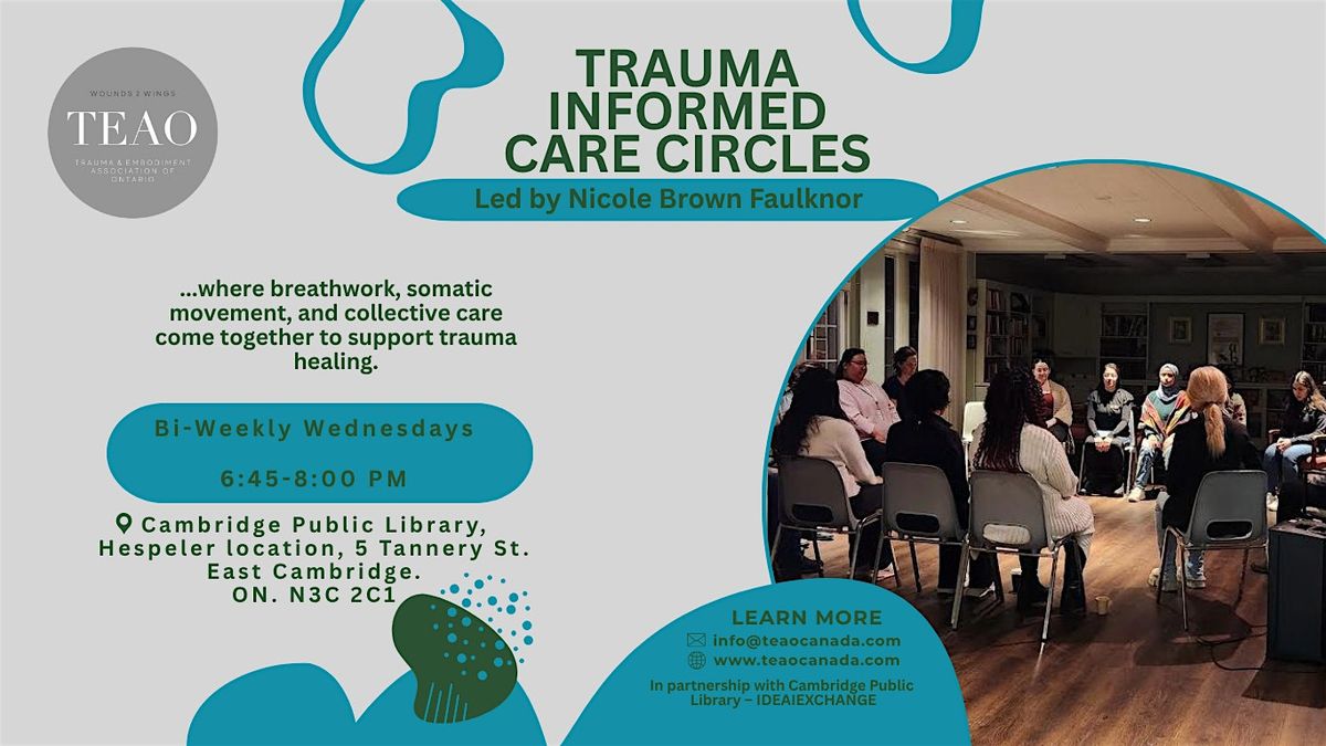 Trauma-Informed Care Circles are a gentle in-person offering grounded in trauma-responsive care and community connection. Each session provides guided somatic practices and a quiet space for reflection, embodiment, and regulation.