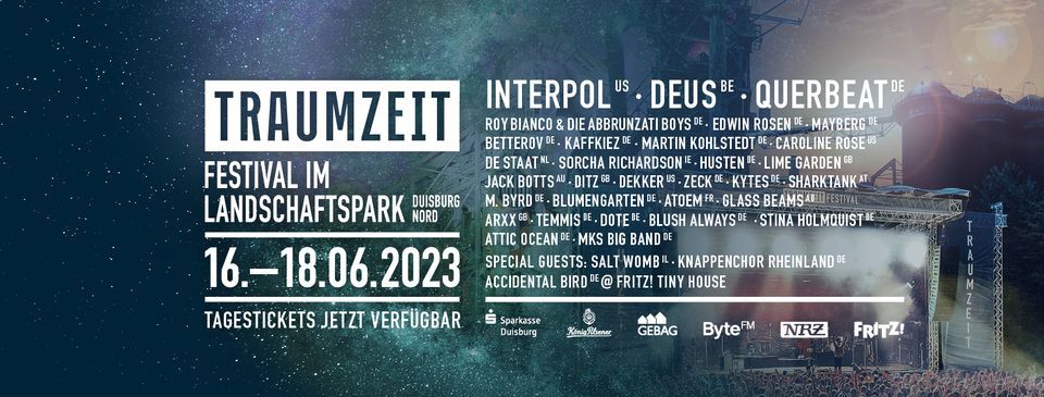 Interpol (US) | dEUS (BE) | Querbeat (DE) | Roy Bianco & Die Abbrunzati Boys (DE) | Edwin Rosen (DE) | Betterov (DE)| Kaffkiez (DE) | Martin Kohlstedt (DE) | Mayberg (DE) | Caroline Rose (US) | De Staat (NL) | Sorcha Richardson (IE) | Husten (DE) | Lime Garden (UK) | Jack Botts (AU) | Ditz (GB) | Dekker (US) | Zeck (DE) | Kytes (DE) | Sharktank (AT) | M.Byrd (DE) | Blumengarten (DE) | Glass Beams (AU) | Arxx (GB) | Acidental Bird (DE) |Temmis (DE) | Dote (DE) | Stina Holmquist (DE) | Attic Ocean (DE)