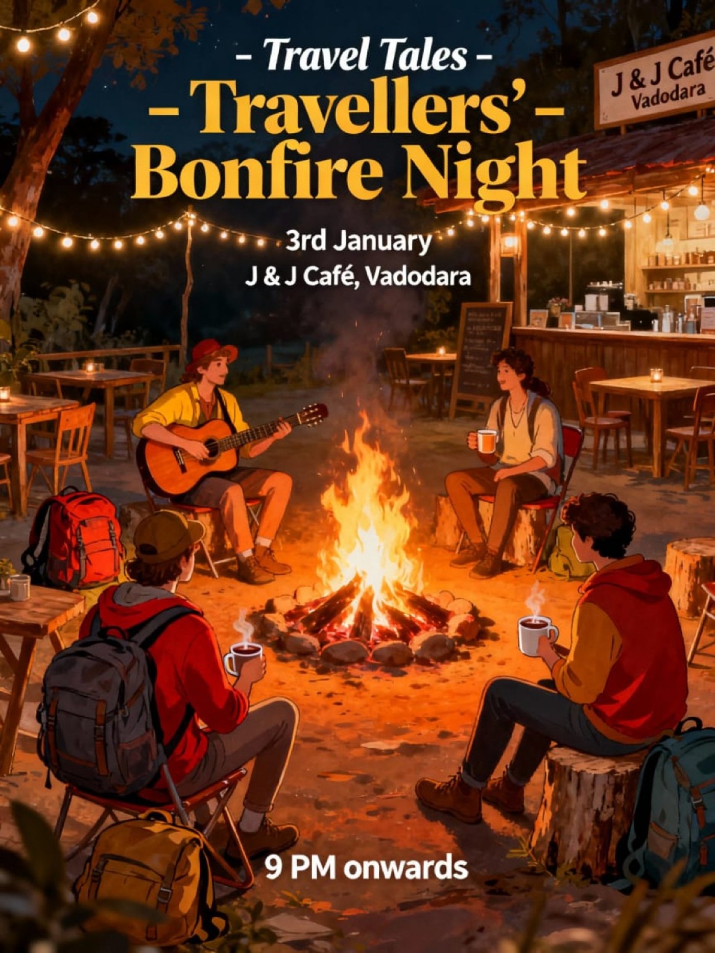 Get ready to ignite your wanderlust at the Travel Tales present Travellers' Bonfire Night! 🌍🔥 Join us on January 3, 2026, at 9:00 PM at the cozy J&J Cafe, located on Canal Road in New Alkapuri, Ankodiya, Vadodara, Gujarat 391330, India.