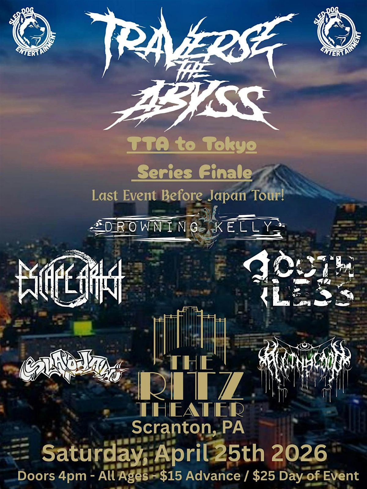 Traverse the Abyss returns to The Ritz in Scranton, PA for the TTA to Tokyo: Series Finale, their final hometown event before departing for their upcoming Japan tour! Join us for a night of live music as the band celebrates this milestone and prepares to take their sound overseas.