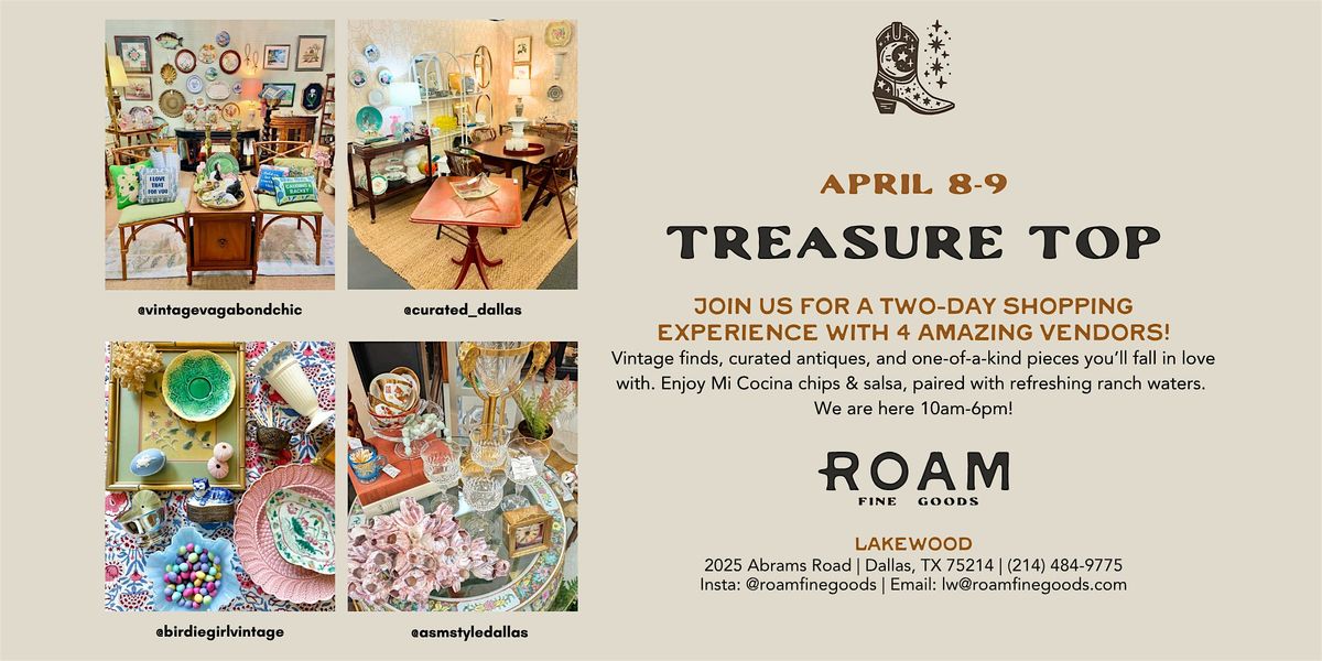 Vintage finds, curated antiques & one-of-a-kind pieces — shop 4 amazing vendors at Roam Fine Goods Lakewood! Free entry, April 8–9.