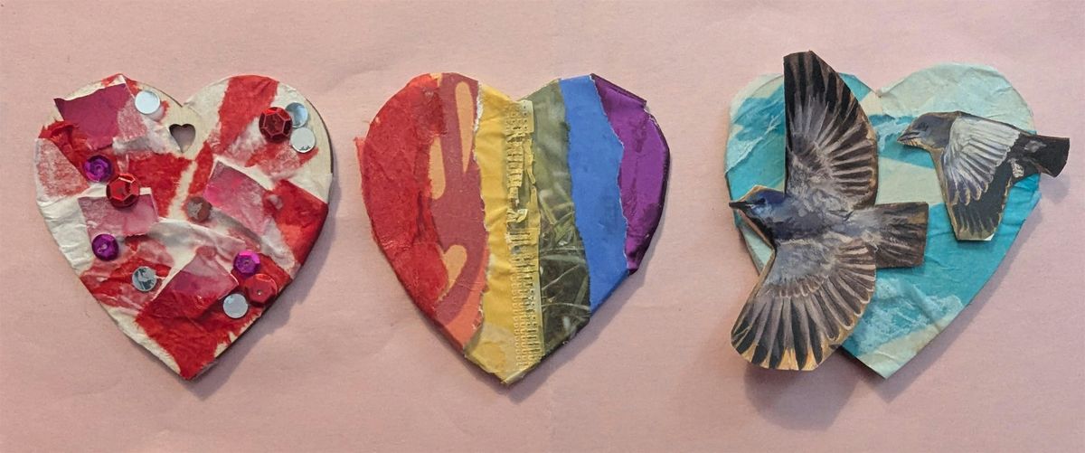 In this workshop attendees will decorate two wooden hearts using glue, scissors, and colored paper. Transforming a bare heart into a vibrant creation. Plus, these hearts can be hung as an ornament and gifted to a friend. Attendees will leave with two heart collages and a greater sense of calm.