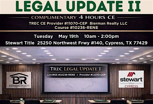 Join us in person at Stewart Title - Cypress TX for this complimentary Legal Update II class. Breakfast/Lunch provided. 9:30am Check-InAbout this Event