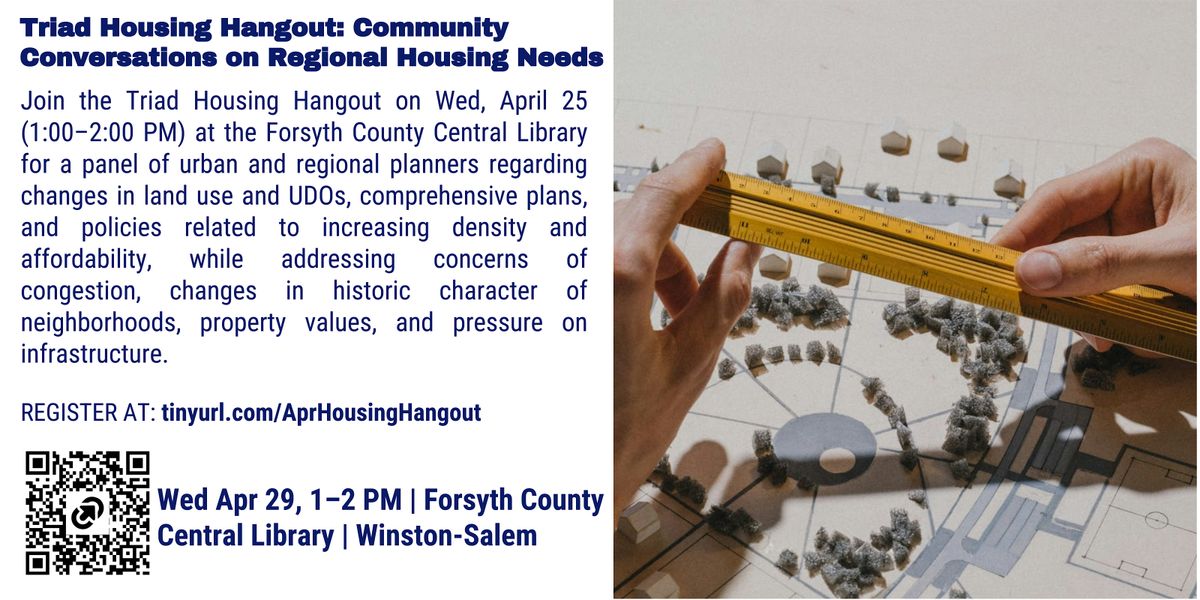 Join us for the next Triad Housing Hangout on Wednesday, April 29 (1:00–2:00 PM) at the Forsyth County Central Library, featuring a panel of urban and regional planners regarding changes in land use and UDOs, comprehensive plans, and policies related to increasing density and affordability, while addressing concerns of congestion, changes in historic character of neighborhoods, property values, and pressure on infrastructure.