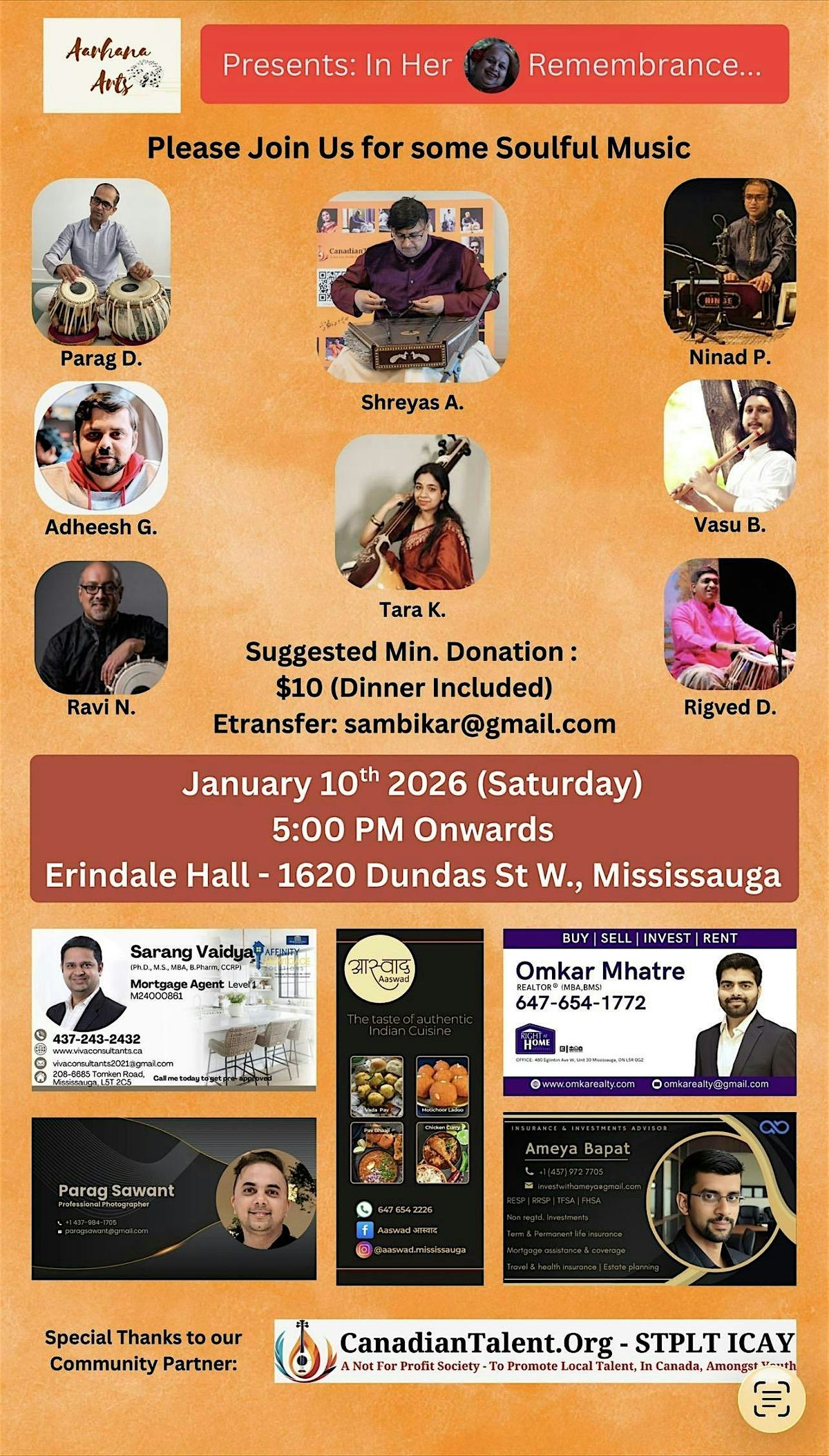 Join us in celebrating the life and music of her life with vocal performances, tabla solo and santoor and flute recital and jugalbandi.