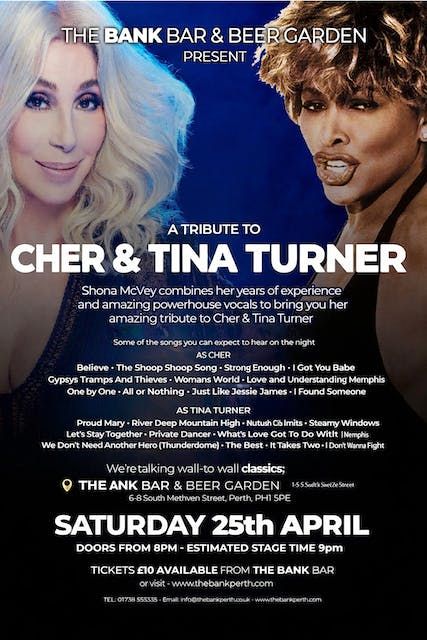 Get ready for a night of pure powerhouse vocals and iconic hits as we celebrate the legends Cher and Tina Turner 🎤✨Join us at The Bank Bar & Beer Garden for an electrifying tribute performed by Shona McVey, delivering all the attitude, glamour, and unforgettable anthems you know and love.