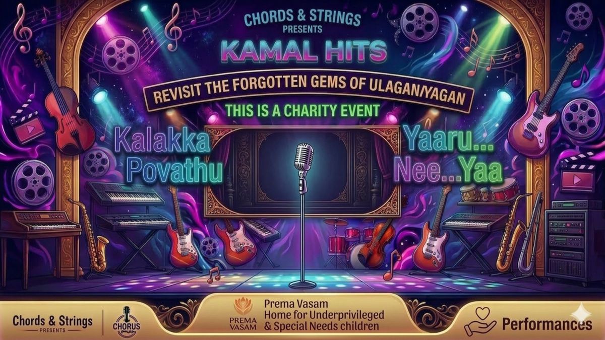 Chords & Strings Presents A TRIBUTE & Nostalgic Journey Through Kamal Haasan’s 80s onwards . Electrifying and Vibrant LIVE PerformanceExperience Tamil New Year evening with NONSTOP musical time travel as we revisit the soul-stirring, often-overlooked gems of Ulaganayagan Kamal Haasan’s early career.Set in the prestigious Music Academy, this show brings the magic from the 80s back to life with professional precision.A professionally managed, interactive show designed to keep the audience engaged from the first note to the final beat.30 gems of Fast melody, Peppy & Solo Songs of Andavar Hits.Performed by Passionate, Vocally Trained Chords & Strings Singers on high-fidelity karaoke tracks. Singers are working professionals from different industry but aligned with dedication to Music. No 'Super Singer' here—just super singingYou could see you in them and who knows!!!!! next may be you, if you are passionate to sing.Satisfaction Guaranteed!!. Come encourage the artists and enjoy an unforgettable evening.To make our show for a cause and change the lives of the special children, we will be presenting the total ticket proceeds to the foundation during the event.So your ticket will have a meaning and add value to a special child's future. This is a Charity EventTea & Snacks Included in the Ticket Price.
