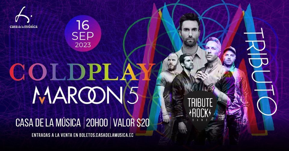 La Casa de la Música presenta un extraordinario tributo a COLDPLAY, una de las bandas británicas de pop más grande del momento, reconocida por su capacidad compositiva y energía; y a MAROON 5 uno de los grupos de pop-rock estadounidenses más exitosos del siglo XXI. El nivel musical de las dos bandas ha llegado a trascender por generaciones, consiguiendo giras y éxitos por todo el mundo, llegando a ser las bandas más escuchadas en estos tiempos.Este tributo se lo realizará con la banda Tribute Rock, integrado por destacados músicos de la escena local como: