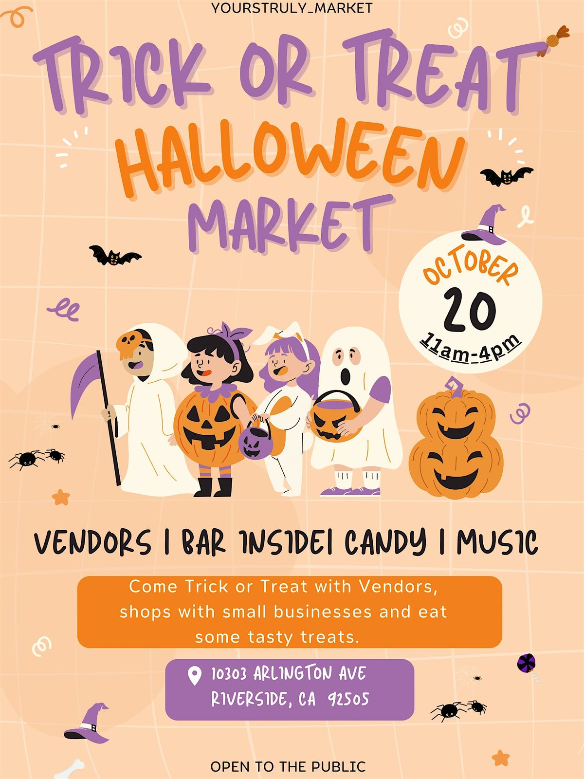 Welcome to the Trick or Treat Vendor Market at VFW Riverside ! Join us at Halloween Market for a spooktacular event filled with local vendors offering unique treats and goodies. Get into the Halloween spirit and browse through a variety ofvendors with amazing items. Whether you're looking for accessories, cups, or delicious snacks, you'll find it all here. Don't miss out on this opportunity to support small businesses and enjoy a fun day out. See you there!