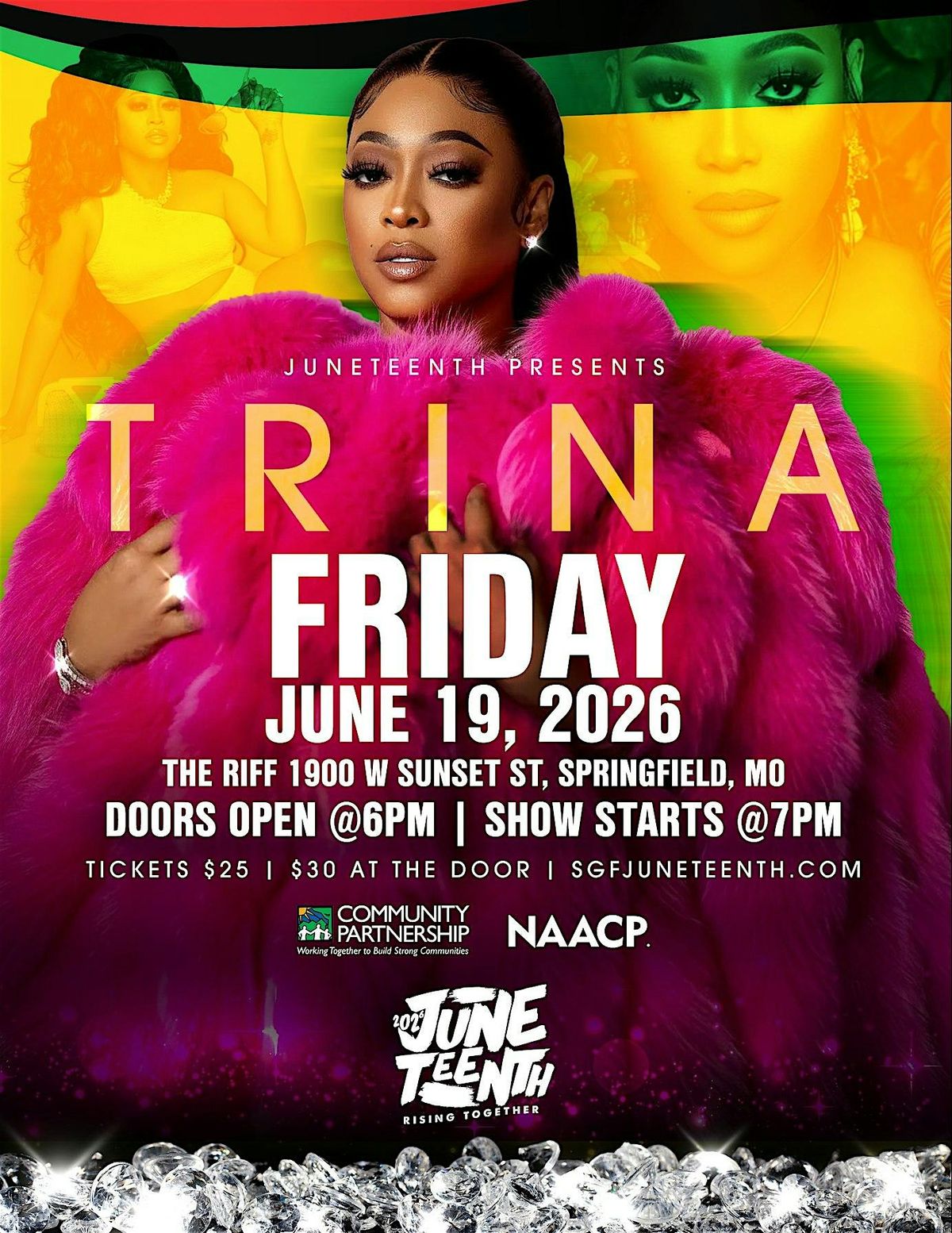 Celebrate Juneteenth with featured artist Trina at The Riff on 6/19/26. This is an 18 and up event. Doors at 6PM show at 7PM. All tickets are general admission. Limited seating available and is first come, first serve. Cash only at door for $30