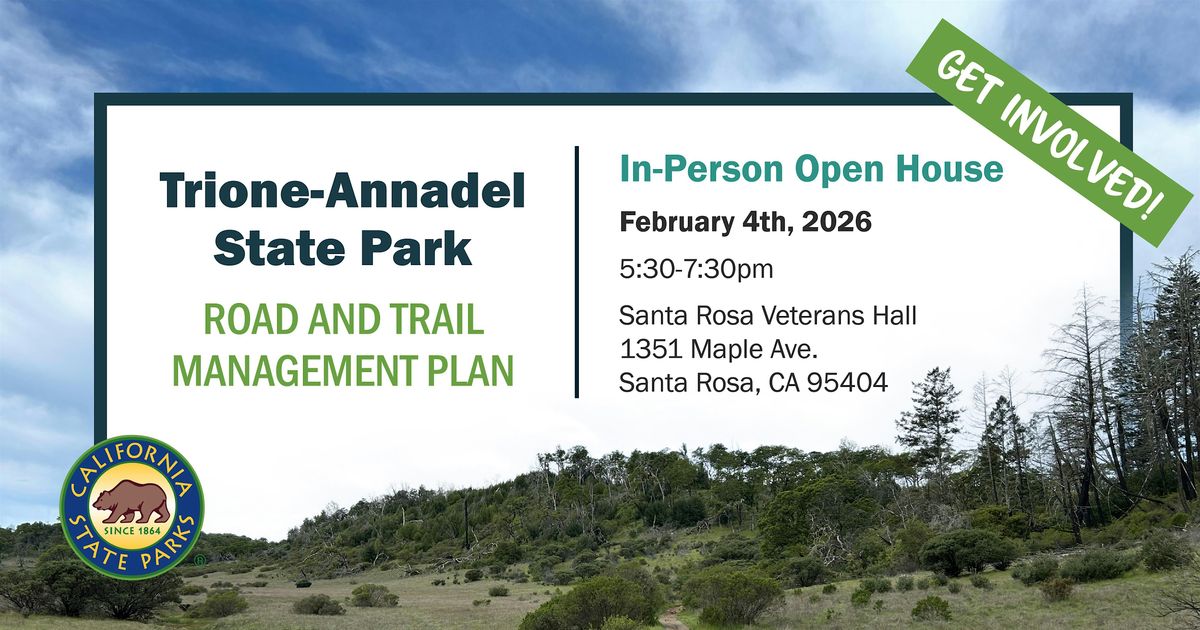 The Road and Trail Management Plan (RTMP) process for Trione-Annadel State Park is underway, and we are looking for your input. Please join us for an in-person open house meeting on Wednesday, February 4th, 2026 (5:30-7:30pm). This meeting will provide opportunities to learn more about the RTMP process, review the parkwide and zone recommendations and to provide feedback on the public draft RTMP. The meeting will be held at the Santa Rosa Veterans Memorial Building (SRVMB) located at 1351 Maple Ave, Santa Rosa, CA 95404. If you require special accommodations, please contact [email protected] in advance of the meeting.