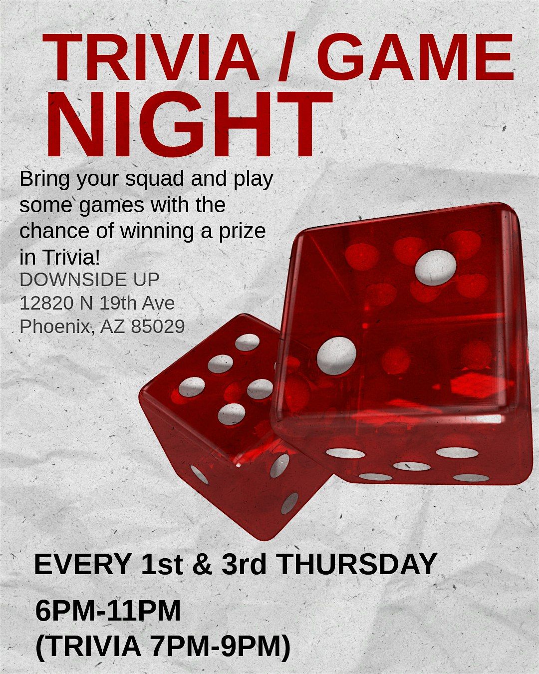 Join us on Every 1st & 3rd Thursday for a fun and casual Trivia/Game Night at Downside Up! Bring your friends, test your knowledge, and enjoy some laughs in a relaxed vibe. Whether you're a trivia pro or just in it for the fun, this night’s all about good times and great company. Don’t miss out! There will be prizes for trivia winners! Trivia runs from 7PM-9PM