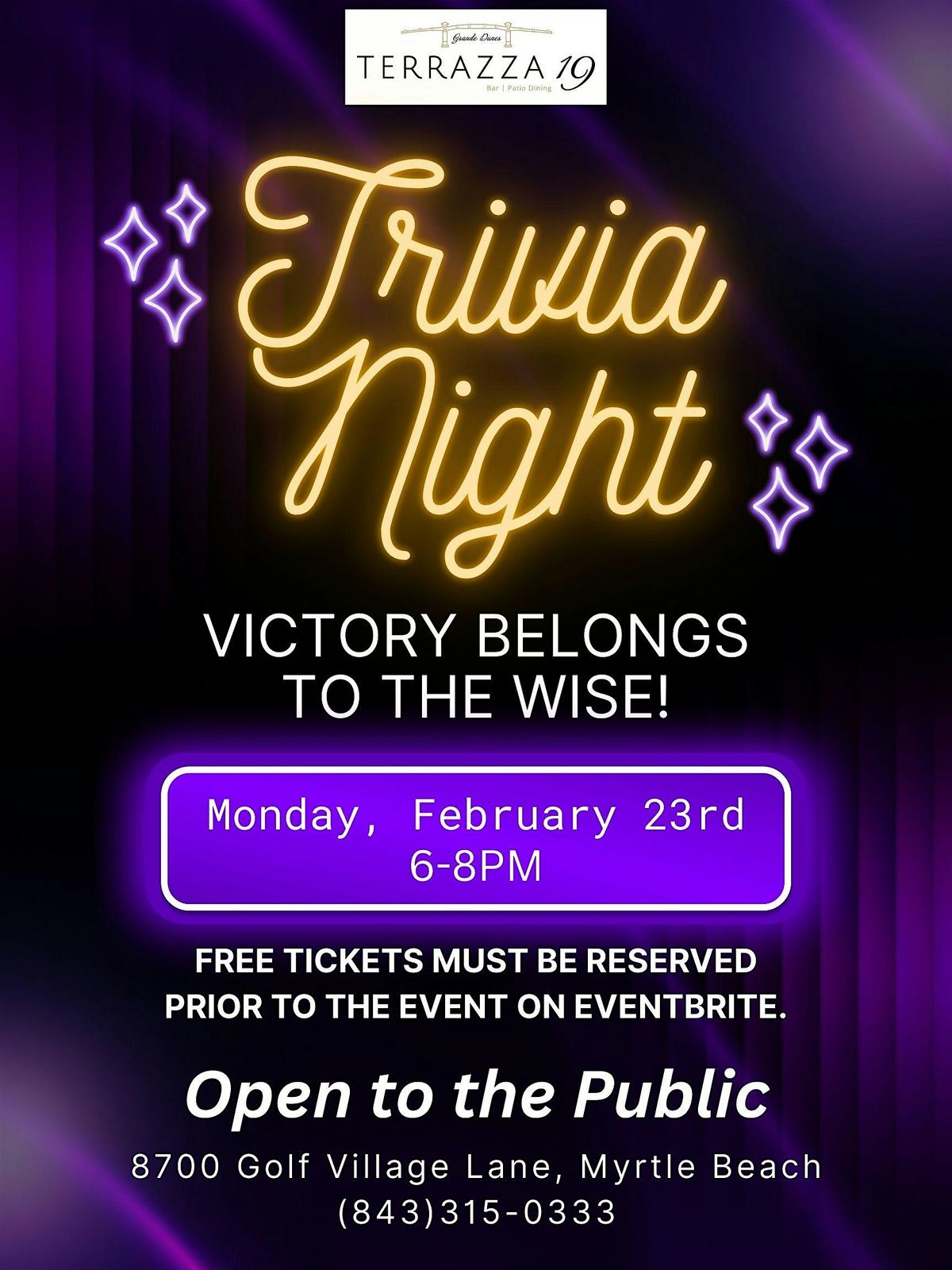 Come test your knowledge and enjoy a night of friendly competition with friends and family. Put your thinking caps on and get ready for a night of brain-teasing questions and exciting prizes! Don't miss out on this opportunity to showcase your trivia skills.