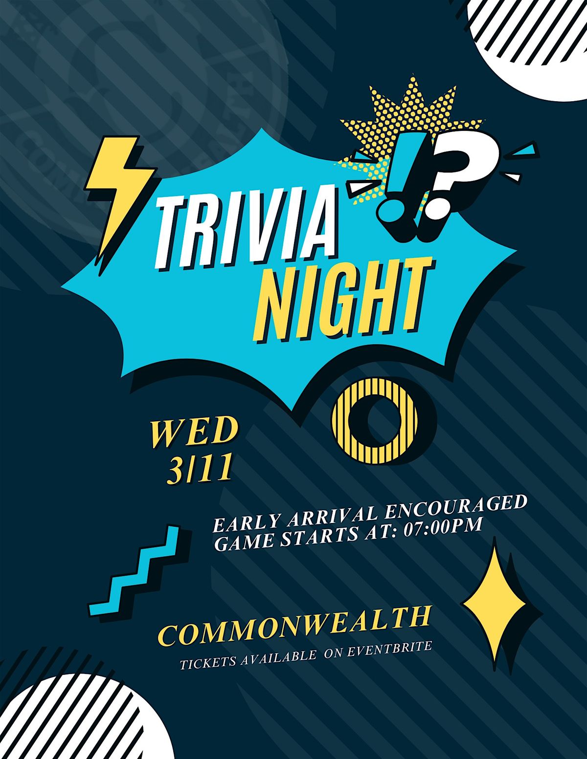 Drinks, laughs, and a little friendly competition! Join us for Trivia Night 3/11, Teams, prizes, and bragging rights await!About this Event