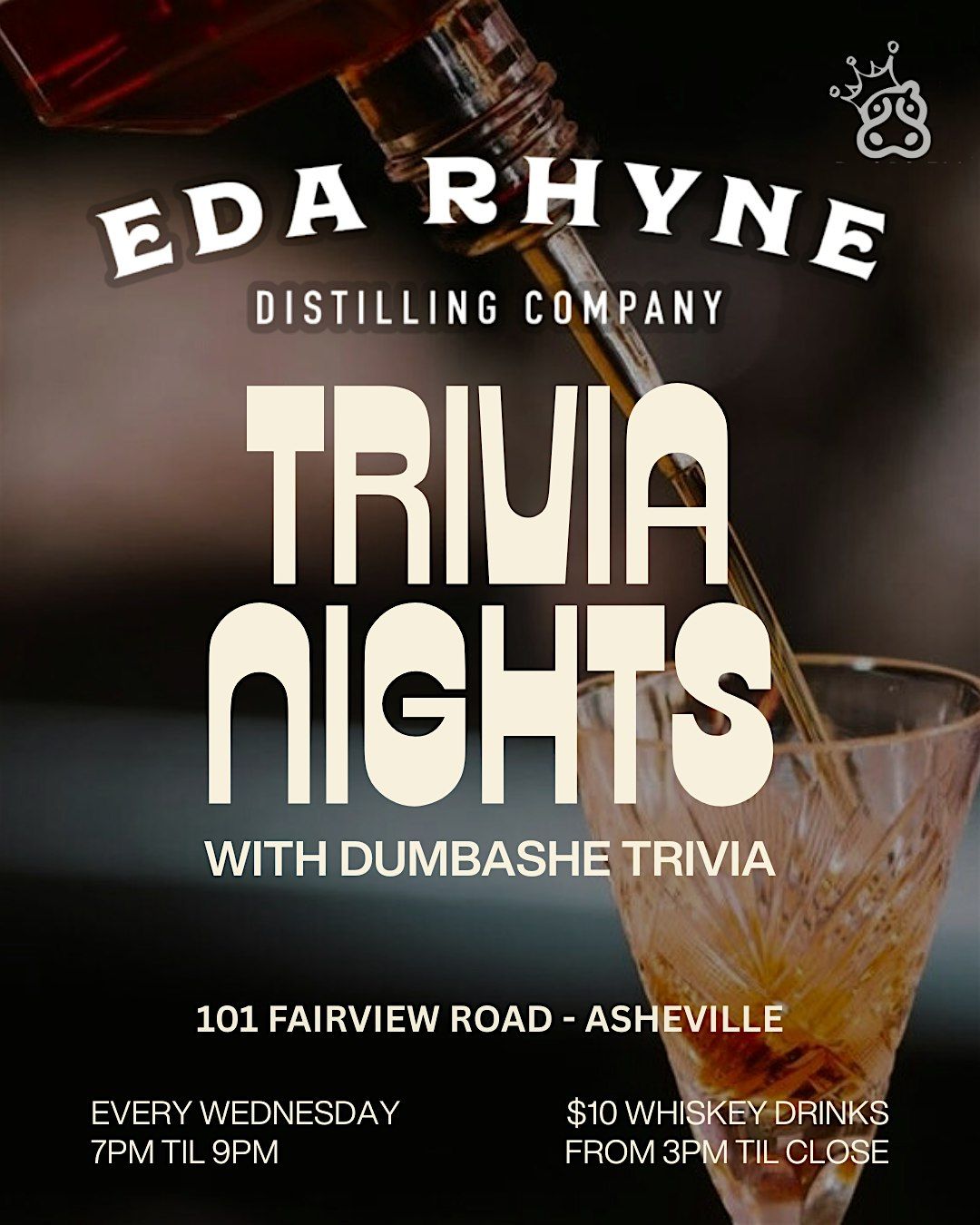 Get ready for a fun-filled evening at Eda Rhyne Distilling Company! Join us in person for Trivia Night where you can team up, test your brainpower, and enjoy some great drinks. Whether you're a trivia pro or just in it for laughs, it's the perfect way to spend your night. Bring your friends, brush up on your random facts, and let's see who takes the crown!